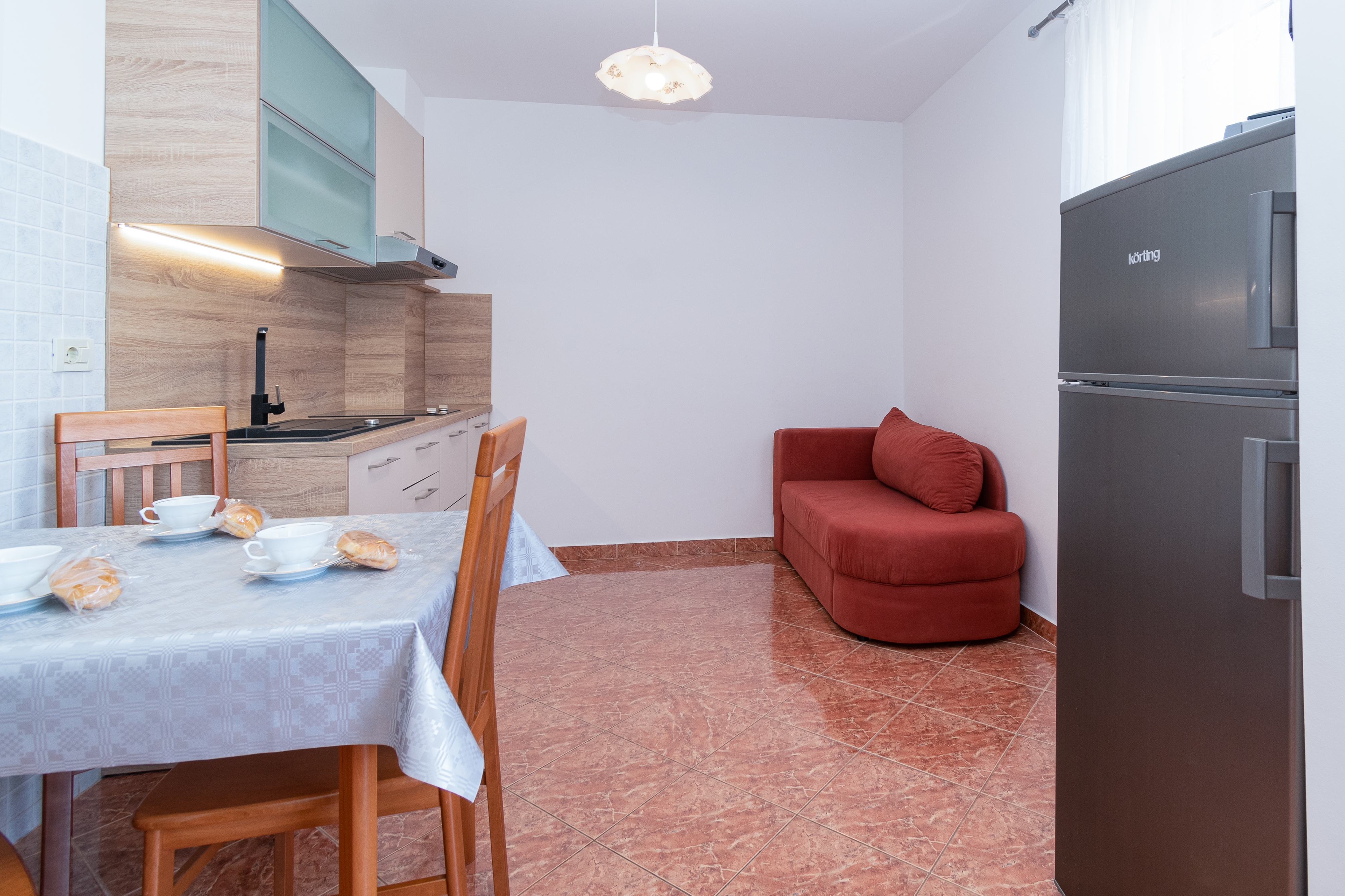 Studio flat can accommodate 3 guests. Beds are situated in 1 sleeping rooms, but also in the living room, within 34m2. Guests can use a private balcony to enjoy the warm summer evenings. The studio offers the sea view. Food can be prepared using barbecue which is shared with other guests too. Shared pool is on disposal during stay. This accommodation unit welcomes pets at an additional charge. INCLUDED IN THE PRICE: tourist tax, final cleaning, air-conditioning, pool, parking, internet, hairdryer. OPTIONAL ADDITIONAL COSTS: pets (€10.00 per night). The availability of additional services for your chosen dates of stay, as well as their prices (if none are listed) must be checked ahead of time. Any additional services not shown in the price calculation are payable directly to the property owner and only if used by the visitor.