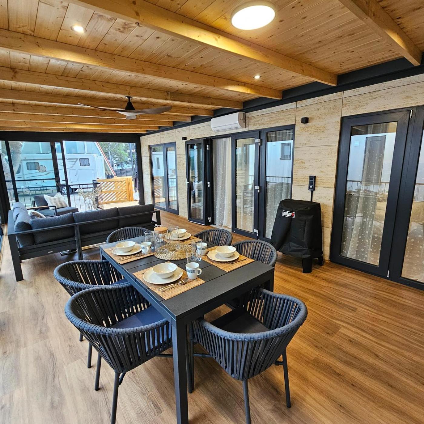 Mobile Home. Featuring a private entrance, this air-conditioned mobile home consists of 1 living room, 2 separate bedrooms and 2 bathrooms with a walk-in shower and a hairdryer. Guests will find a stovetop, a refrigerator, a dishwasher and kitchenware in the fully equipped kitchen. The mobile home also offers a barbecue. Boasting a terrace, this mobile home also provides a washing machine, a coffee machine and a flat-screen TV. The unit offers 4 beds.