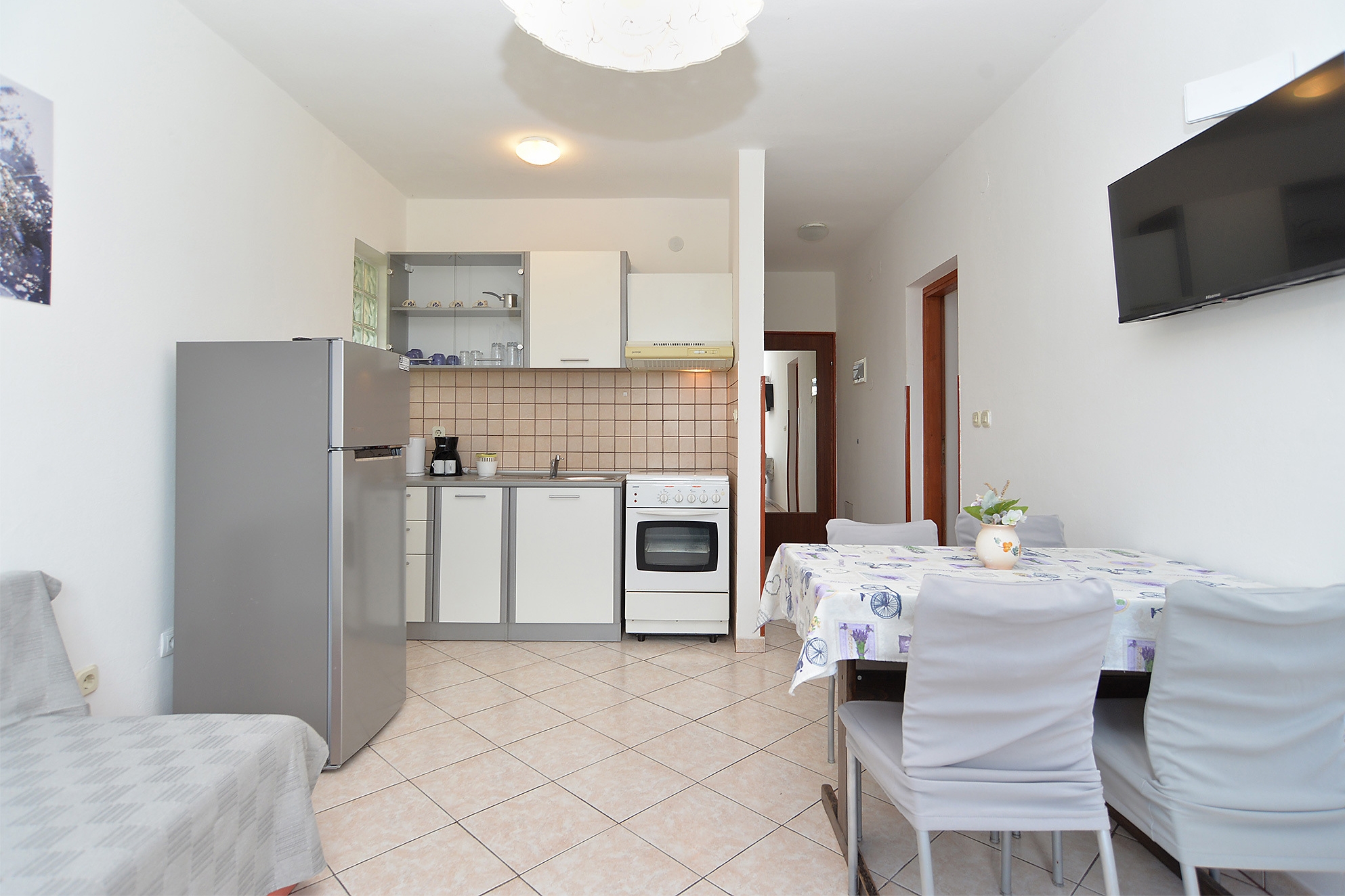 Apartment can accommodate 4 guests. Beds are situated in 1 sleeping rooms, but also in the dining room, within 34m2. Guests can use a private terrace to enjoy the warm summer evenings. Food can be prepared using barbecue which is shared with other guests too. INCLUDED IN THE PRICE: tourist tax, final cleaning, air-conditioning, parking, internet, baby cot, hairdryer. The availability of additional services for your chosen dates of stay, as well as their prices (if none are listed) must be checked ahead of time. Any additional services not shown in the price calculation are payable directly to the property owner and only if used by the visitor.