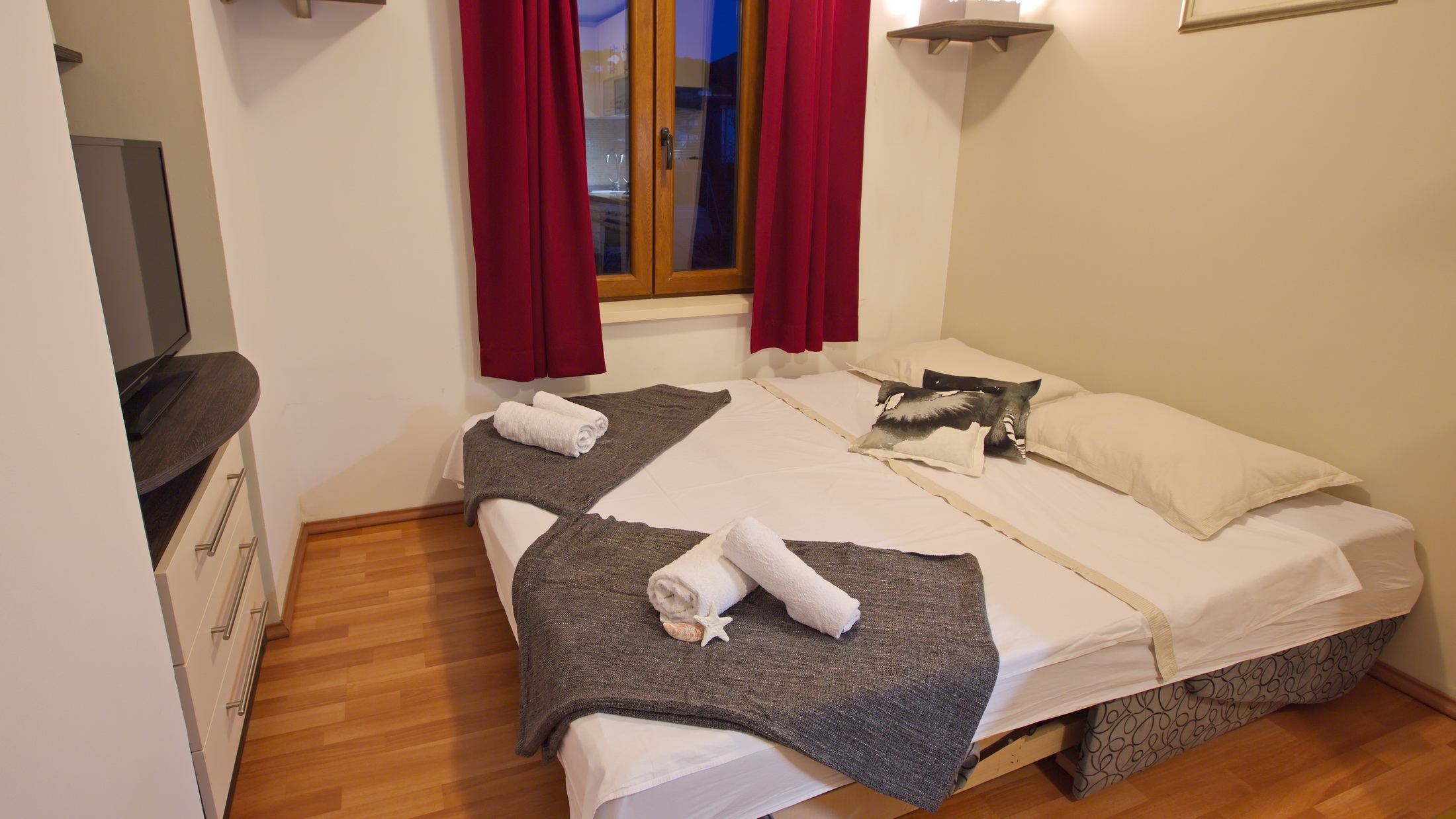 Apartment can accommodate 3 guests. Beds are situated in 1 sleeping rooms, but also in the living room, within 25m2. Guests can use a private terrace to enjoy the warm summer evenings. Food can be prepared using barbecue which is shared with other guests too. Other guests or hosts pass through the terrace of the booked accommodation unit. Some of the rooms of the accommodation unit are not connected with the rest of the unit. INCLUDED IN THE PRICE: tourist tax, final cleaning, air-conditioning, parking, internet, baby cot, iron, ironing board, hairdryer. The availability of additional services for your chosen dates of stay, as well as their prices (if none are listed) must be checked ahead of time. Any additional services not shown in the price calculation are payable directly to the property owner and only if used by the visitor.