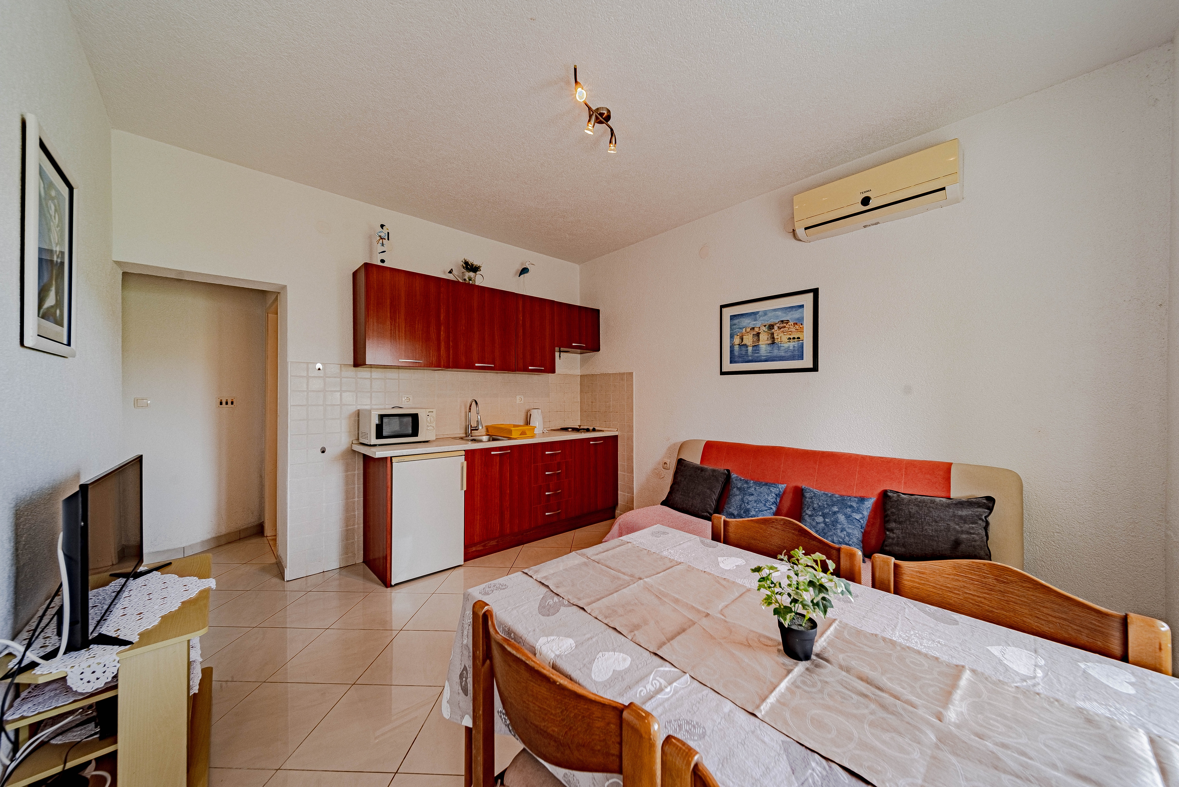 Apartment can accommodate 3 guests. Beds are situated in 1 sleeping rooms, but also in the dining room, within 32m2. Guests can use a private terrace to enjoy the warm summer evenings. Food can be prepared using barbecue which is shared with other guests too. This accommodation unit welcomes pets at an additional charge. INCLUDED IN THE PRICE: tourist tax, final cleaning, air-conditioning, parking, internet, boat mooring, iron, hairdryer. OBLIGATORY ADDITIONAL COSTS: short stay fee (surcharge depending on a number of booked nights: 30% - 1, 20% - 2, 10% - 3). OPTIONAL ADDITIONAL COSTS: laundry (€15.00 washing), boat (€60.00 per night), pets (€5.00 per night). The availability of additional services for your chosen dates of stay, as well as their prices (if none are listed) must be checked ahead of time. Any additional services not shown in the price calculation are payable directly to the property owner and only if used by the visitor.