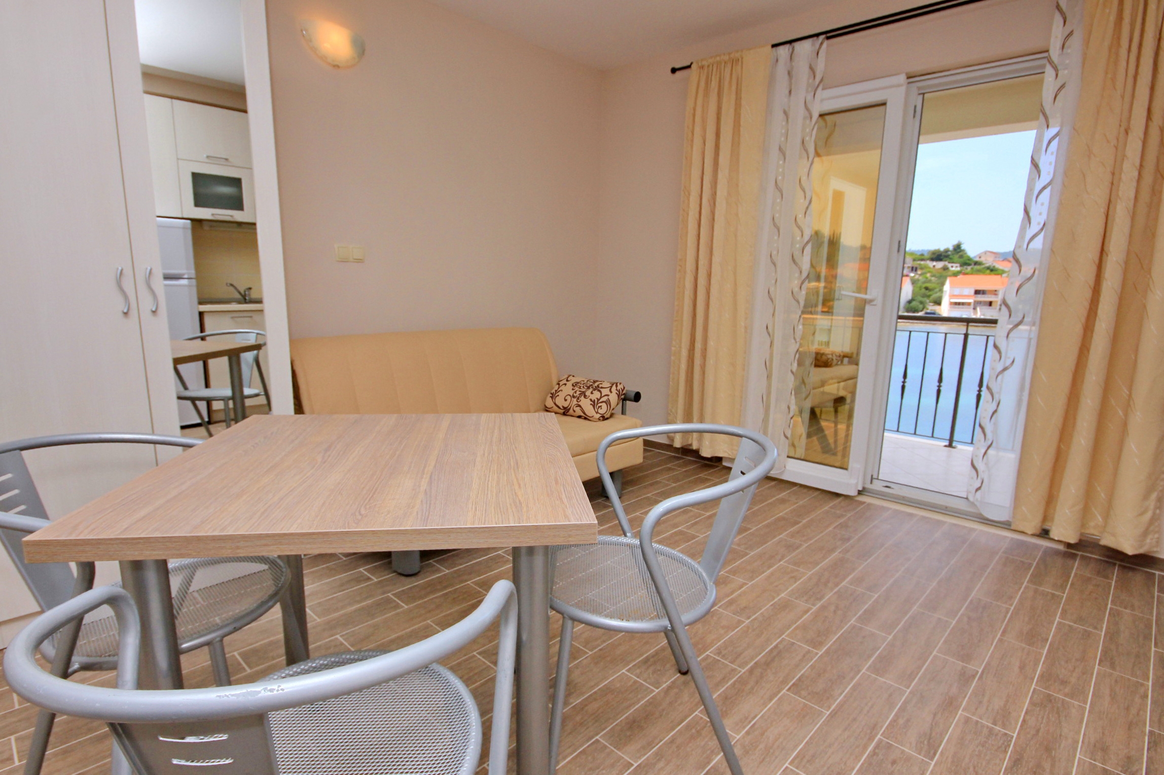 Studio flat can accommodate 2 guests. Beds are situated in 1 sleeping rooms, within 29m2. Guests can use a private balcony to enjoy the warm summer evenings. The studio offers the sea view. Food can be prepared using barbecue which is shared with other guests too. Shared pool is on disposal during stay. INCLUDED IN THE PRICE: tourist tax, final cleaning, air-conditioning, pool, parking, internet, boat mooring, baby cot, iron, ironing board, hairdryer, sunshade, sunchairs. The availability of additional services for your chosen dates of stay, as well as their prices (if none are listed) must be checked ahead of time. Any additional services not shown in the price calculation are payable directly to the property owner and only if used by the visitor.