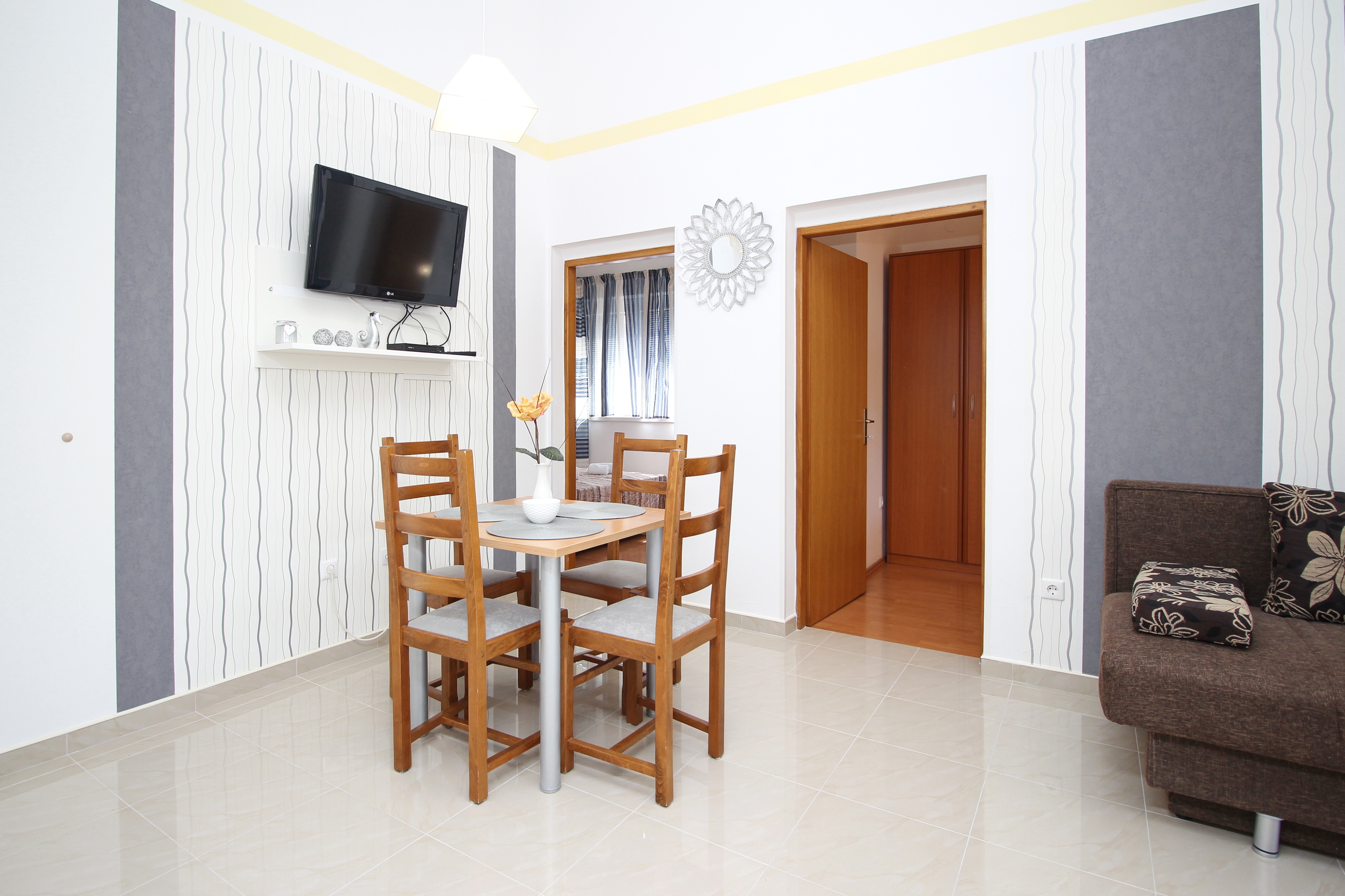 Apartment can accommodate 5 guests. Beds are situated in 2 sleeping rooms, but also in the living room, within 49m2. Guests can use a private terrace to enjoy the warm summer evenings. The apartment offers the sea view. This accommodation unit welcomes pets at an additional charge. INCLUDED IN THE PRICE: final cleaning, air-conditioning, parking, internet. OBLIGATORY ADDITIONAL COSTS: tourist tax (adults €0.93 - €2.20 nightperson, discount for children aged 12 - 17), short stay fee (surcharge depending on a number of booked nights: 30% - 1, 20% - 2, 10% - 3). OPTIONAL ADDITIONAL COSTS: pets (€10.00 per night). The availability of additional services for your chosen dates of stay, as well as their prices (if none are listed) must be checked ahead of time. Any additional services not shown in the price calculation are payable directly to the property owner and only if used by the visitor.