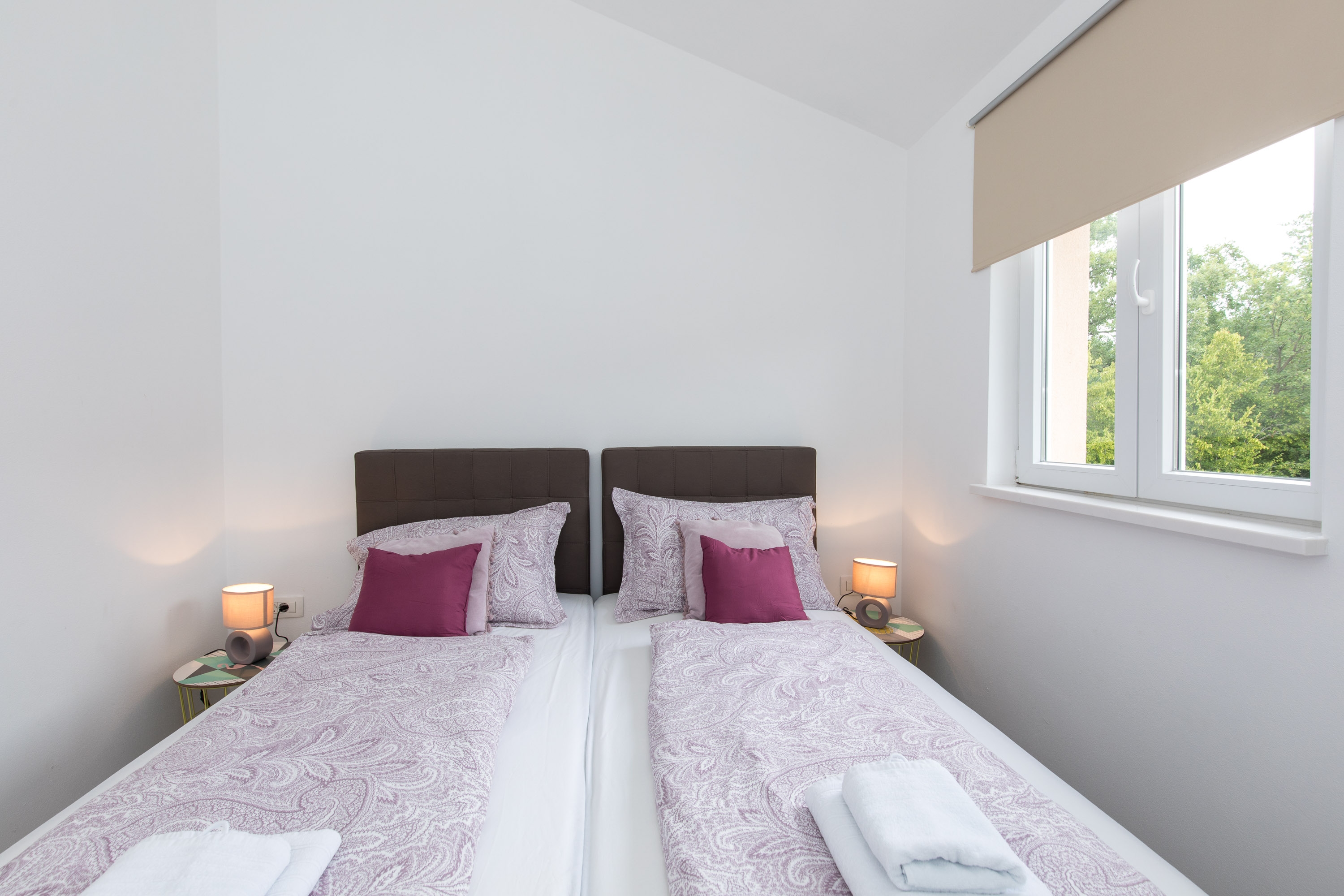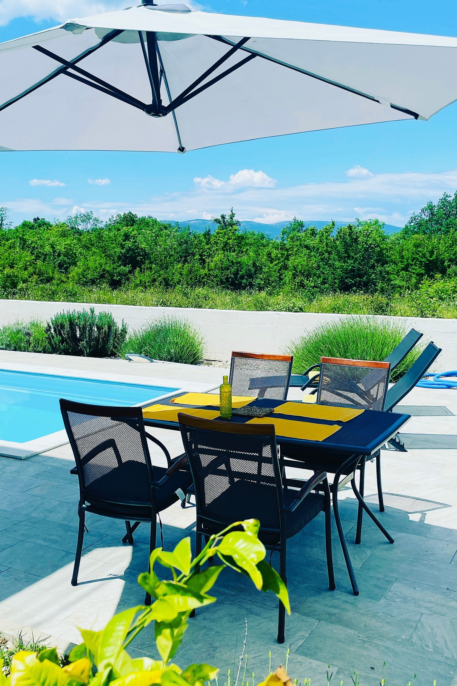 Apartment can accommodate 6 guests. Beds are situated in 2 sleeping rooms, but also in the living room, within 49m2. Guests can use a private terrace to enjoy the warm summer evenings. Shared pool is on disposal during stay. This accommodation unit welcomes pets at an additional charge. INCLUDED IN THE PRICE: tourist tax, final cleaning, air-conditioning, pool, parking, internet. OPTIONAL ADDITIONAL COSTS: pets (€10.00 per night). The availability of additional services for your chosen dates of stay, as well as their prices (if none are listed) must be checked ahead of time. Any additional services not shown in the price calculation are payable directly to the property owner and only if used by the visitor.