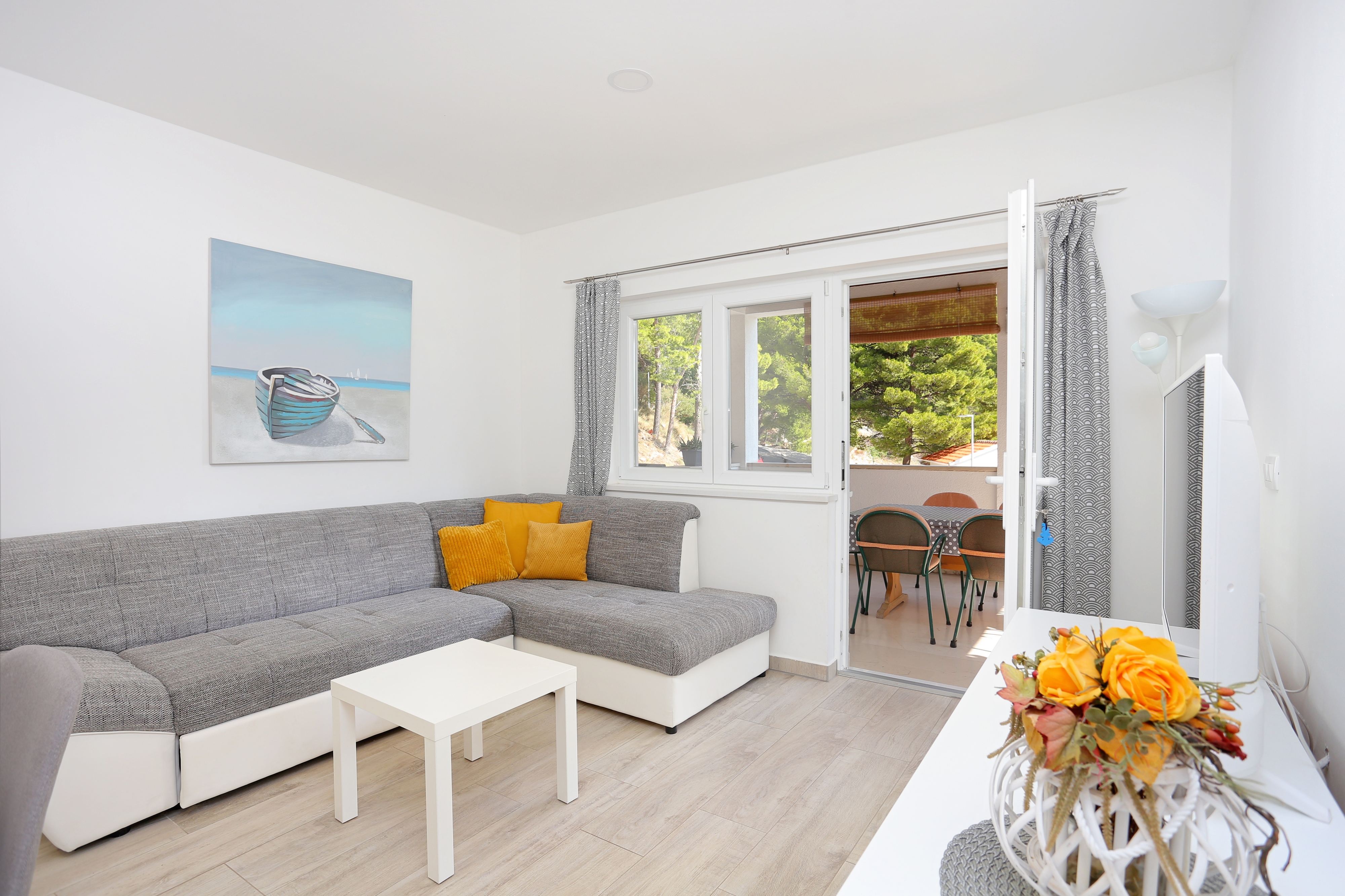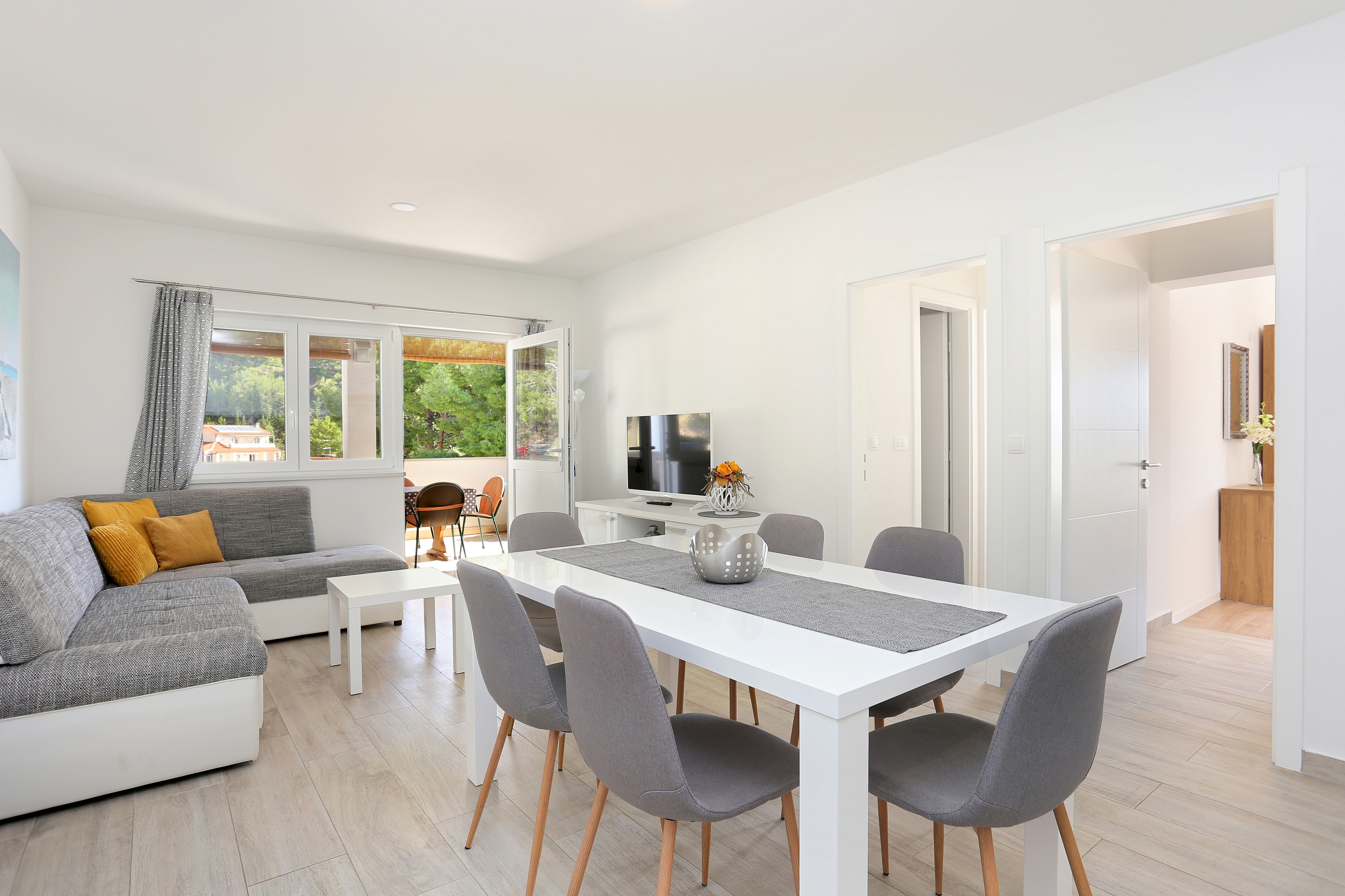 Apartment can accommodate 6 guests. Beds are situated in 2 sleeping rooms, but also in the living room, within 67m2. Guests can use a private terrace to enjoy the warm summer evenings. The apartment offers the sea view. Food can be prepared using barbecue which is shared with other guests too. INCLUDED IN THE PRICE: tourist tax, final cleaning, air-conditioning, parking, internet, baby cot, iron, ironing board, portable barbecue. OBLIGATORY ADDITIONAL COSTS: short stay fee (surcharge depending on a number of booked nights: 30% - 1, 20% - 2, 10% - 3). OPTIONAL ADDITIONAL COSTS: laundry (€5.00 washing). The availability of additional services for your chosen dates of stay, as well as their prices (if none are listed) must be checked ahead of time. Any additional services not shown in the price calculation are payable directly to the property owner and only if used by the visitor.