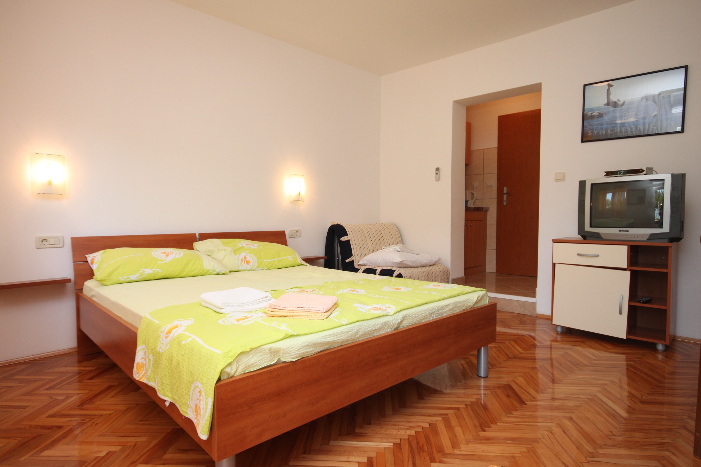 Studio flat can accommodate 3 guests. Beds are situated in 1 sleeping rooms, within 20m2. Guests can use a private balcony to enjoy the warm summer evenings. The studio offers the sea view. Food can be prepared using barbecue which is shared with other guests too. This accommodation unit welcomes pets at an additional charge. INCLUDED IN THE PRICE: tourist tax, final cleaning, air-conditioning, parking, internet, baby cot, iron, ironing board, hairdryer, portable barbecue. OPTIONAL ADDITIONAL COSTS: pets (€5.00 per night). The availability of additional services for your chosen dates of stay, as well as their prices (if none are listed) must be checked ahead of time. Any additional services not shown in the price calculation are payable directly to the property owner and only if used by the visitor. Discounts to the base price: free day 14=13 (for reservations of 14 or more days you get one free day for the stay until 31122026).