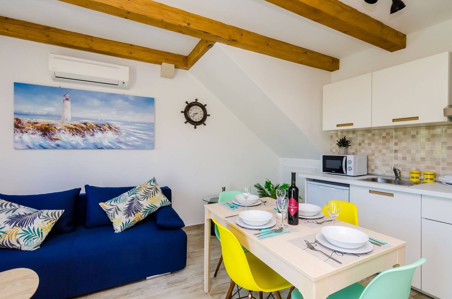 Apartment can accommodate 4 guests. Beds are situated in 1 sleeping rooms, but also in the living room, within 35m2. Food can be prepared using barbecue which is shared with other guests too. There is no balcony or terrace in the reserved accommodation unit. INCLUDED IN THE PRICE: tourist tax, final cleaning, air-conditioning, parking, internet, baby cot, iron, ironing board, hairdryer. The availability of additional services for your chosen dates of stay, as well as their prices (if none are listed) must be checked ahead of time. Any additional services not shown in the price calculation are payable directly to the property owner and only if used by the visitor.