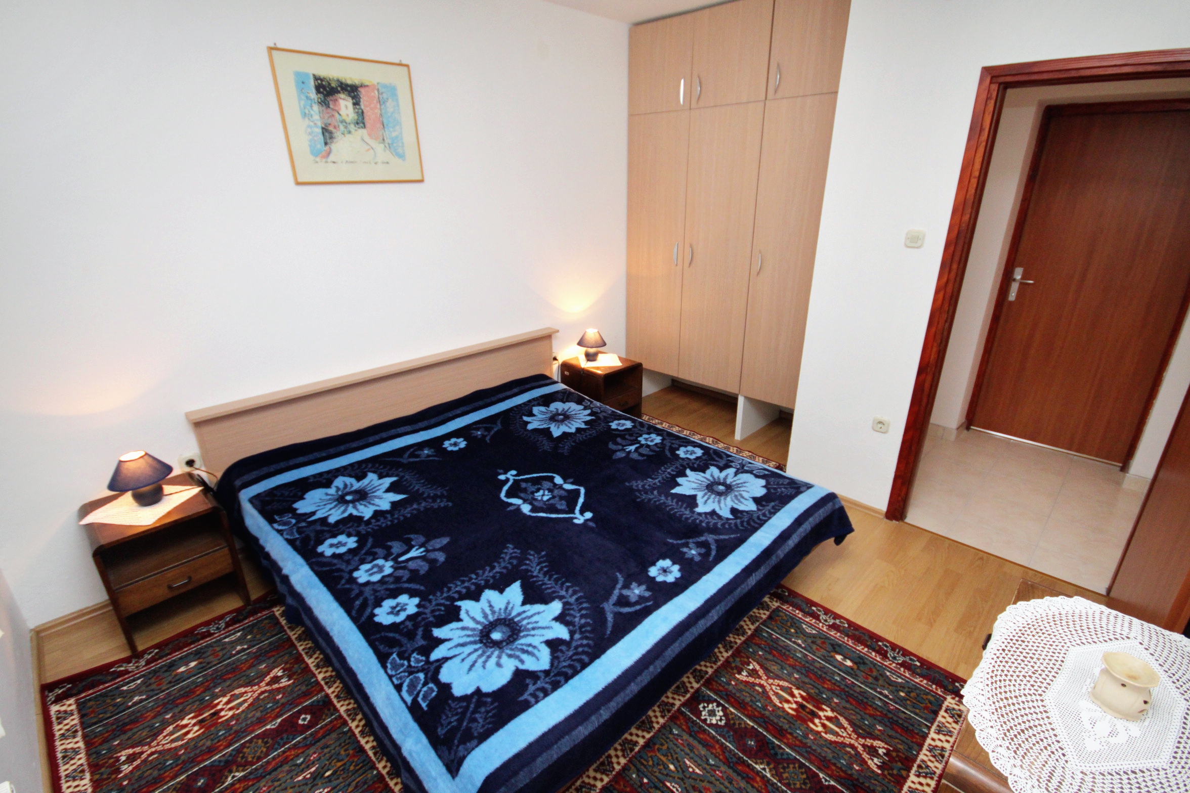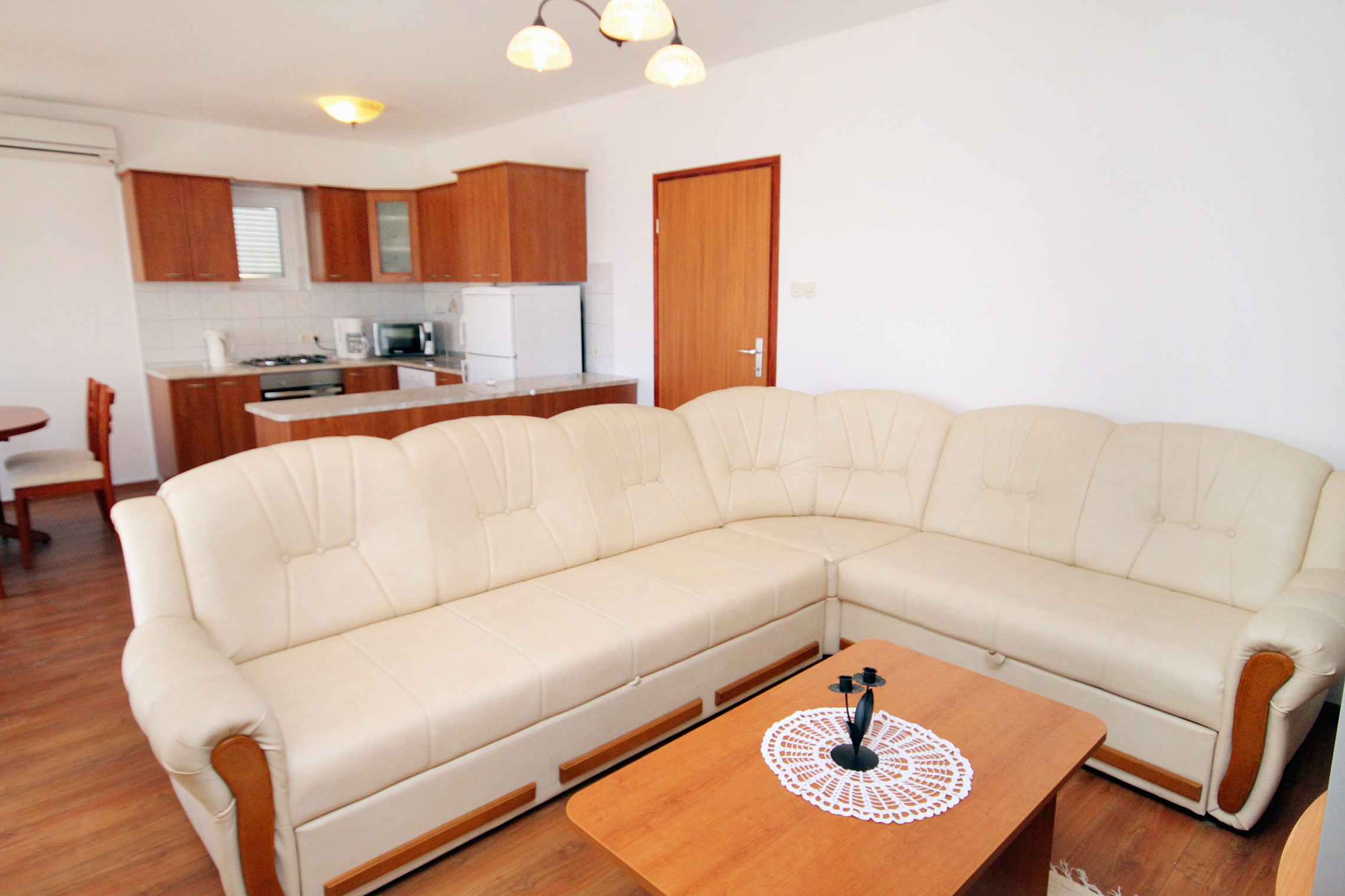 Apartment can accommodate 6 guests. Beds are situated in 2 sleeping rooms, but also in the living room, within 69m2. Guests can use a private terrace to enjoy the warm summer evenings. The apartment offers the sea view. Food can be prepared using barbecue which is shared with other guests too. Shared pool is on disposal during stay. This accommodation unit welcomes pets at an additional charge. INCLUDED IN THE PRICE: tourist tax, final cleaning, air-conditioning, pool, parking, internet, baby cot, iron, ironing board, hairdryer. OBLIGATORY ADDITIONAL COSTS: short stay fee (surcharge depending on a number of booked nights: 30% - 1, 20% - 2, 10% - 3). OPTIONAL ADDITIONAL COSTS: pets (€10.00 per night). The availability of additional services for your chosen dates of stay, as well as their prices (if none are listed) must be checked ahead of time. Any additional services not shown in the price calculation are payable directly to the property owner and only if used by the visitor.