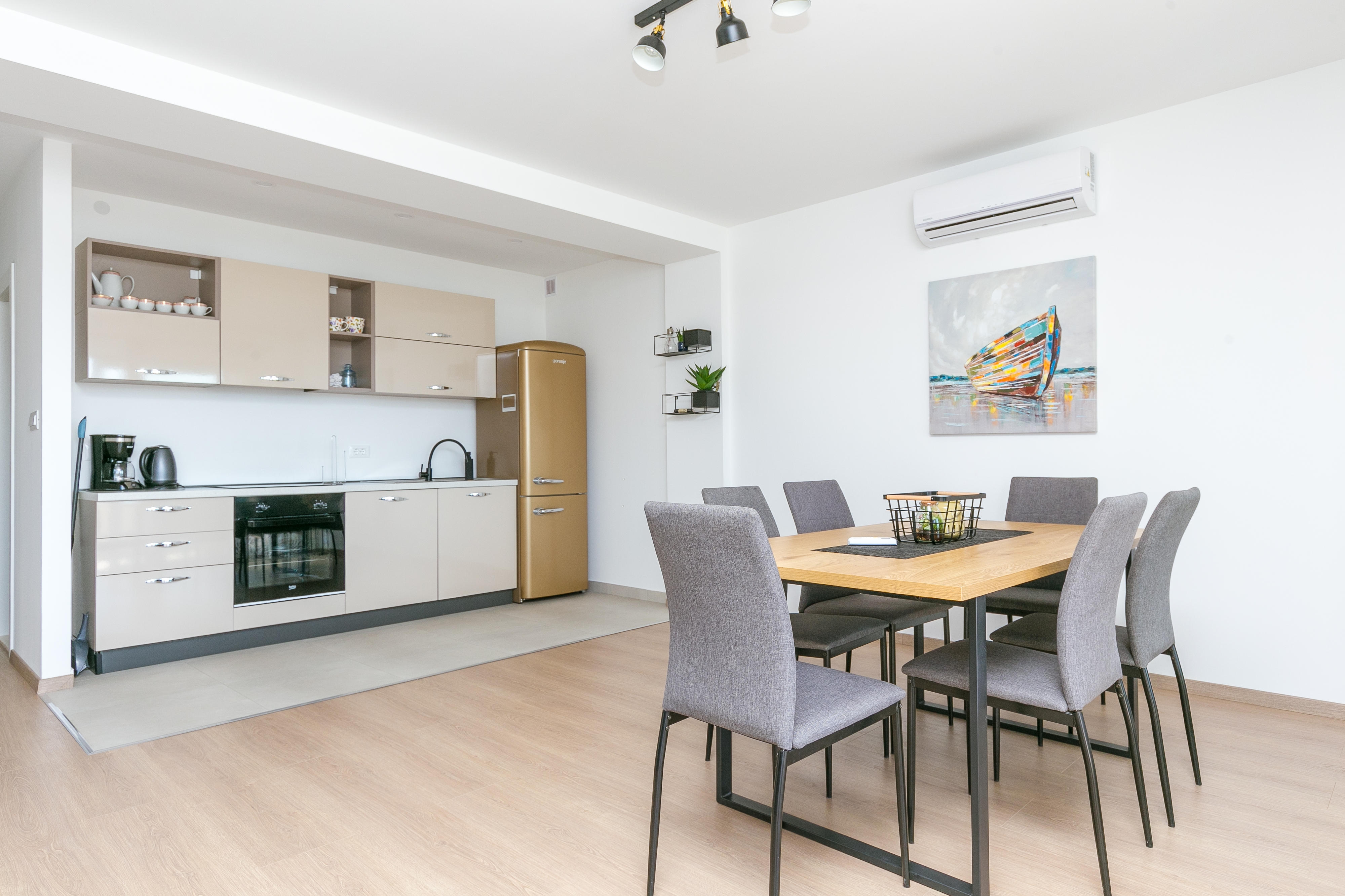 Apartment can accommodate 4 guests. Beds are situated in 2 sleeping rooms, within 89m2. Guests can use a private terrace to enjoy the warm summer evenings. The apartment offers the sea view. Food can be prepared using barbecue which is shared with other guests too. INCLUDED IN THE PRICE: tourist tax, final cleaning, air-conditioning, parking, internet, iron, ironing board, hairdryer, 2 beds for children (included in the price). OBLIGATORY ADDITIONAL COSTS: short stay fee (surcharge depending on a number of booked nights: 30% - 1, 20% - 2, 10% - 3). The availability of additional services for your chosen dates of stay, as well as their prices (if none are listed) must be checked ahead of time. Any additional services not shown in the price calculation are payable directly to the property owner and only if used by the visitor.