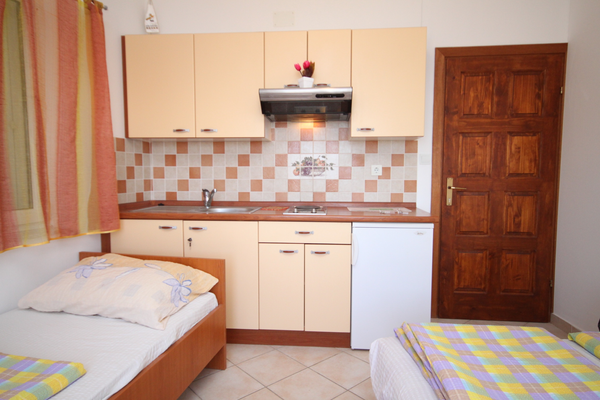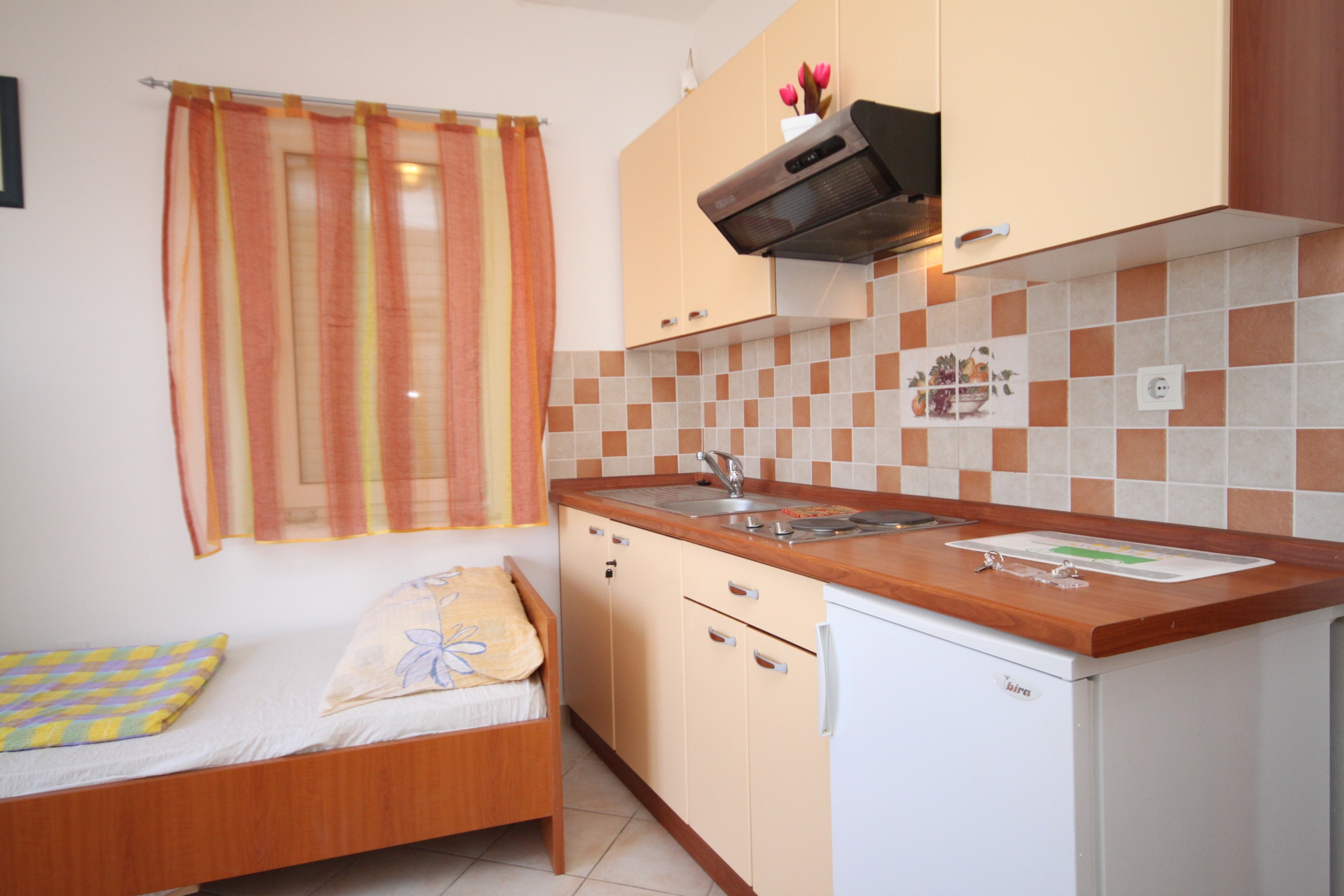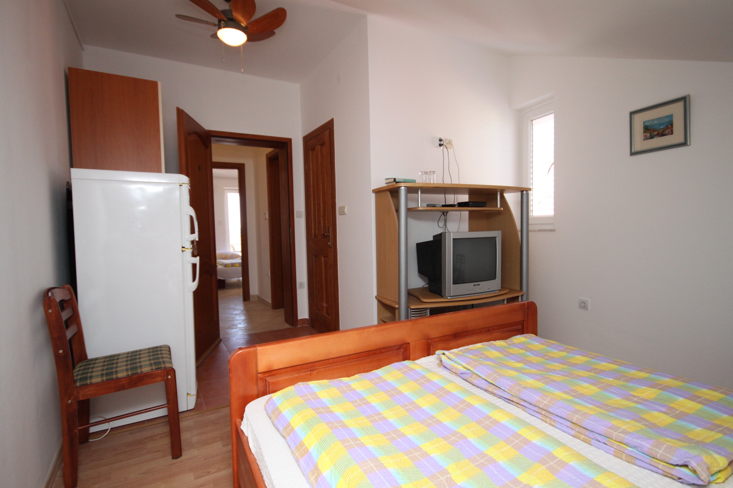 Apartment can accommodate 4 guests. Beds are situated in 1 sleeping rooms, but also in the living room, within 33m2. Guests can use a private terrace to enjoy the warm summer evenings. The apartment offers the sea view. Food can be prepared using barbecue which is shared with other guests too. This accommodation unit welcomes pets at an additional charge. INCLUDED IN THE PRICE: final cleaning, air-conditioning, parking, internet, baby cot, sunshade. OBLIGATORY ADDITIONAL COSTS: tourist tax (adults €0.93 - €1.50 nightperson, discount for children aged 12 - 17). OPTIONAL ADDITIONAL COSTS: breakfast (€12.00, a 50% discount for children aged 4 to 12 years, Children up to age 4 free of charge), half-board (€29.00, a 50% discount for children aged 4 to 12 years, Children up to age 4 free of charge), pets (€5.00 per night). The availability of additional services for your chosen dates of stay, as well as their prices (if none are listed) must be checked ahead of time. Any additional services not shown in the price calculation are payable directly to the property owner and only if used by the visitor.