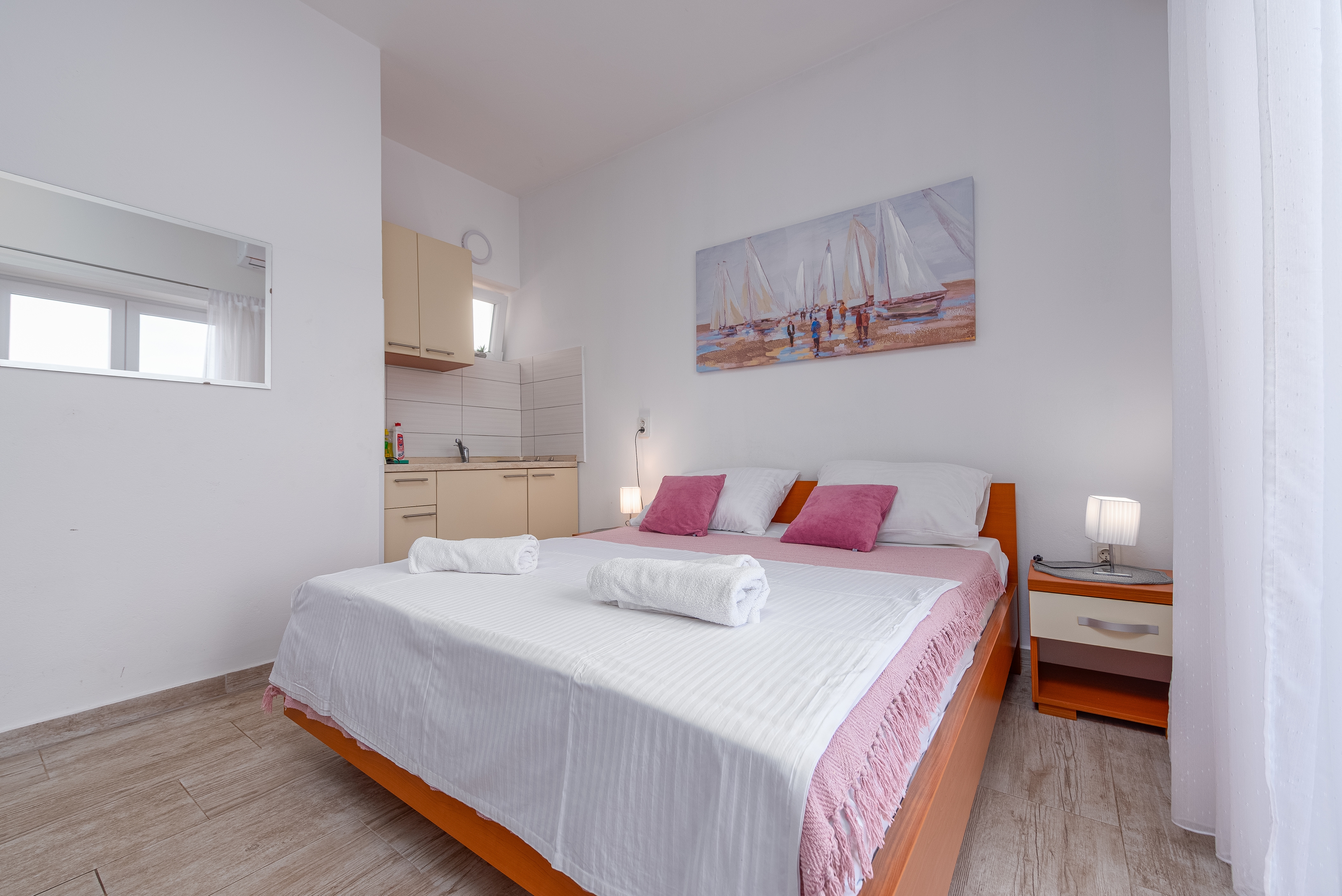 Studio flat can accommodate 2 guests. Beds are situated in 1 sleeping rooms, within 24m2. Guests can use a private terrace to enjoy the warm summer evenings. The studio offers the sea view. Food can be prepared using barbecue which is shared with other guests too. INCLUDED IN THE PRICE: tourist tax, final cleaning, air-conditioning, parking, boat mooring, hairdryer. OBLIGATORY ADDITIONAL COSTS: short stay fee (surcharge depending on a number of booked nights: 30% - 1, 20% - 2, 10% - 3). The availability of additional services for your chosen dates of stay, as well as their prices (if none are listed) must be checked ahead of time. Any additional services not shown in the price calculation are payable directly to the property owner and only if used by the visitor.