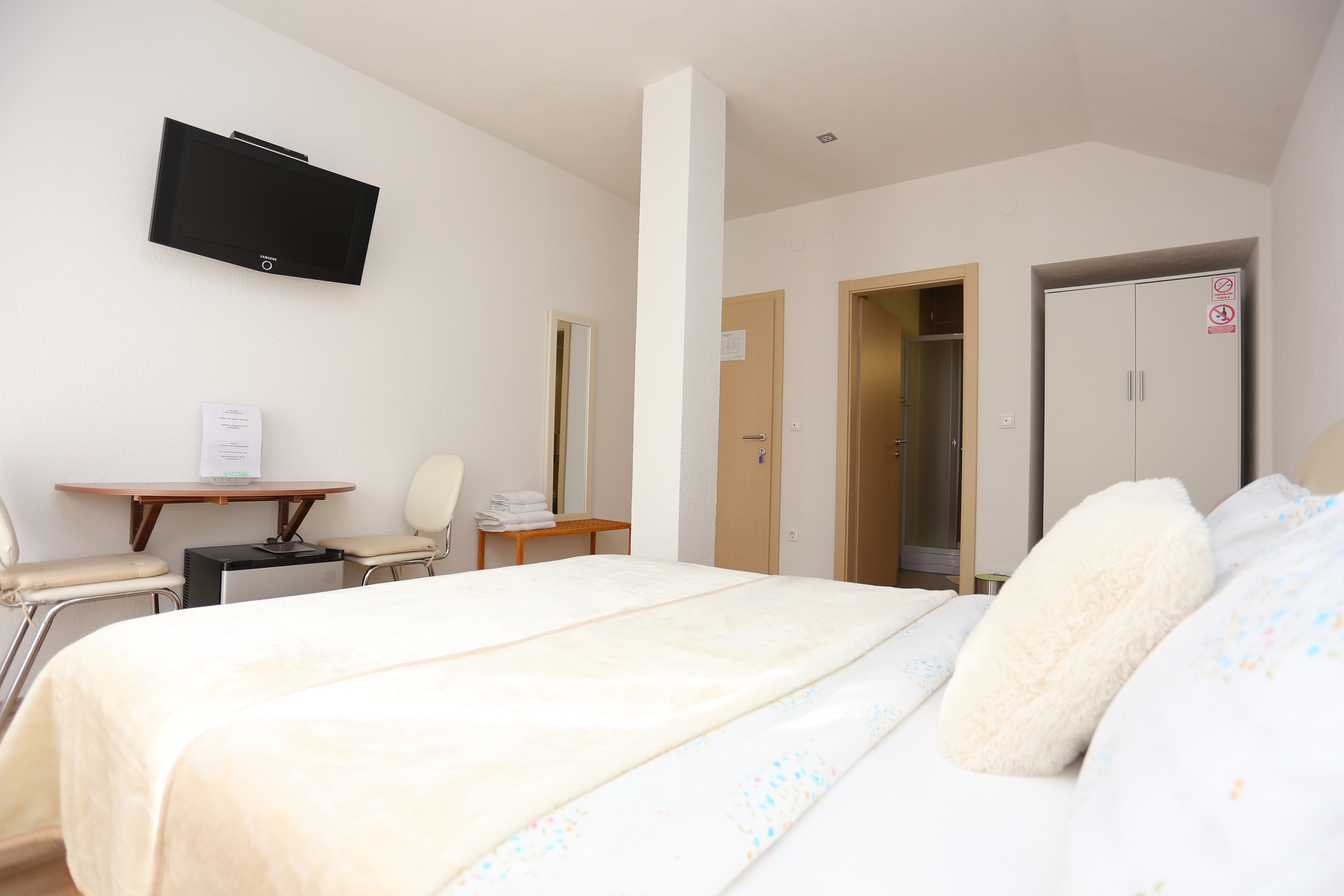 Room can accommodate 2 guests. Beds are situated in 1 sleeping rooms, within 20m2. Reserved accommodation unit is a room with its own bathroom and there is no usage of kitchen. Reserved accommodation unit has a shared balcony. Reserved accommodation unit has a shared terrace. INCLUDED IN THE PRICE: tourist tax, final cleaning, air-conditioning, central heating, parking, internet, baby cot, iron, ironing board, hairdryer. OPTIONAL ADDITIONAL COSTS: breakfast (€5.00, a 50% discount for children aged 4 to 12 years, Children up to age 4 free of charge), laundry (€5.00 washing). The availability of additional services for your chosen dates of stay, as well as their prices (if none are listed) must be checked ahead of time. Any additional services not shown in the price calculation are payable directly to the property owner and only if used by the visitor.