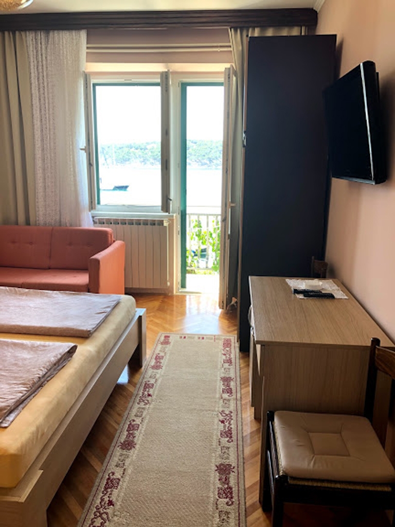 Room can accommodate 2 guests. Beds are situated in 1 sleeping rooms, within 19m2. Guests can use a private balcony to enjoy the warm summer evenings. The room offers the sea view. Food can be prepared using barbecue which is shared with other guests too. Reserved accommodation unit is a room with its own bathroom and there is no usage of kitchen. INCLUDED IN THE PRICE: tourist tax, final cleaning, air-conditioning, parking, internet, baby cot. OBLIGATORY ADDITIONAL COSTS: short stay fee (surcharge depending on a number of booked nights: 30% - 1, 20% - 2, 10% - 3). OPTIONAL ADDITIONAL COSTS: breakfast (€10.00, a 50% discount for children aged 4 to 12 years, Children up to age 4 free of charge), laundry (€3.00 washing), boat mooring (€10.00 per night). The availability of additional services for your chosen dates of stay, as well as their prices (if none are listed) must be checked ahead of time. Any additional services not shown in the price calculation are payable directly to the property owner and only if used by the visitor.