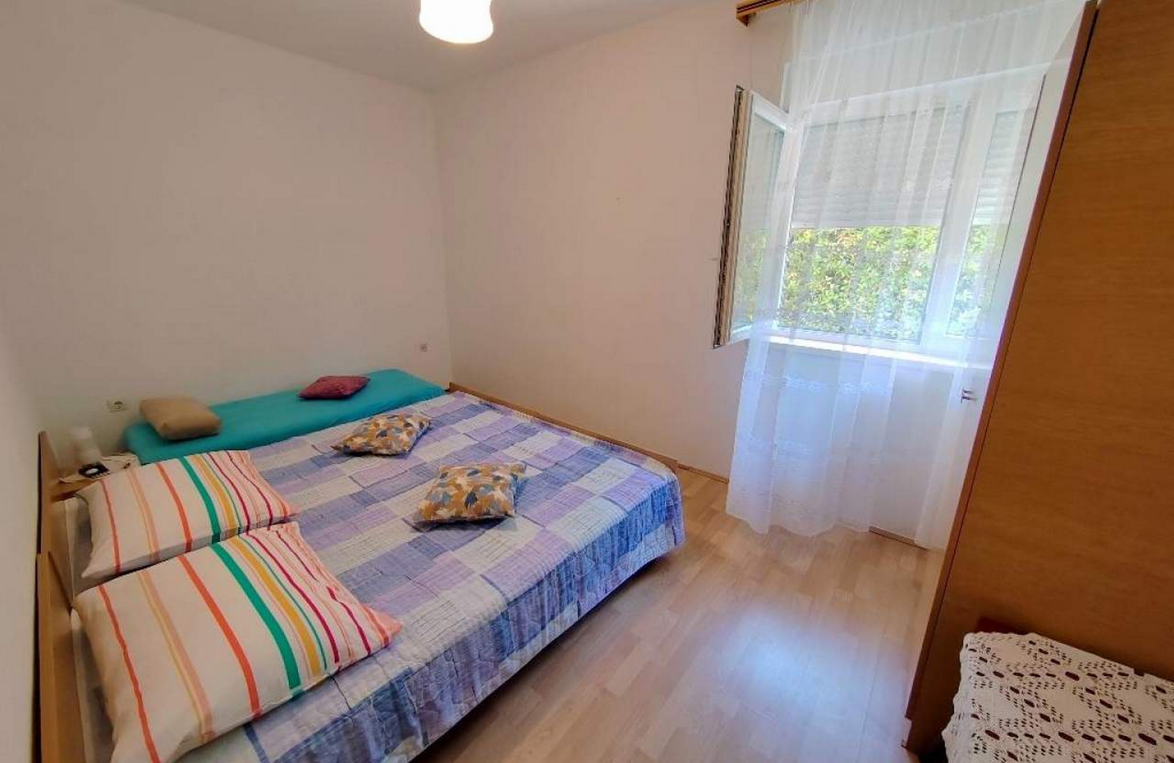Apartment can accommodate 7 guests. Beds are situated in 3 sleeping rooms, within 83m2. Guests can use a private terrace to enjoy the warm summer evenings. Food can be prepared using barbecue which is shared with other guests too. INCLUDED IN THE PRICE: tourist tax, final cleaning, parking, internet, hairdryer. OBLIGATORY ADDITIONAL COSTS: short stay fee (surcharge depending on a number of booked nights: 30% - 1, 20% - 2, 10% - 3). OPTIONAL ADDITIONAL COSTS: air-conditioning (€5.00 per night). The availability of additional services for your chosen dates of stay, as well as their prices (if none are listed) must be checked ahead of time. Any additional services not shown in the price calculation are payable directly to the property owner and only if used by the visitor.