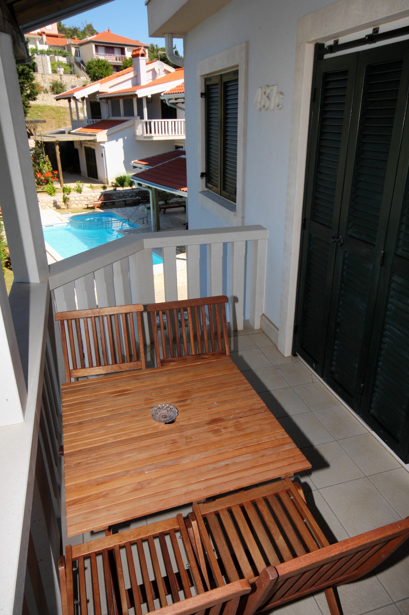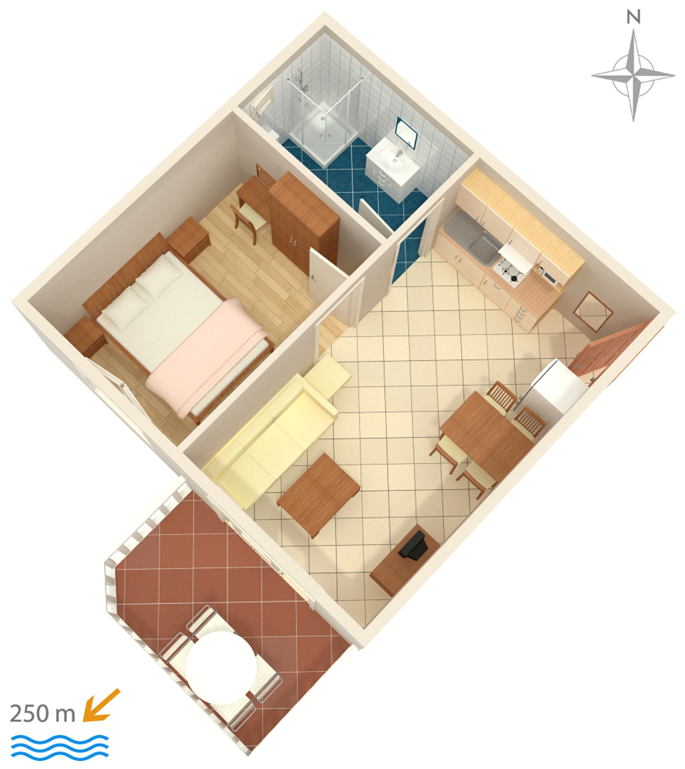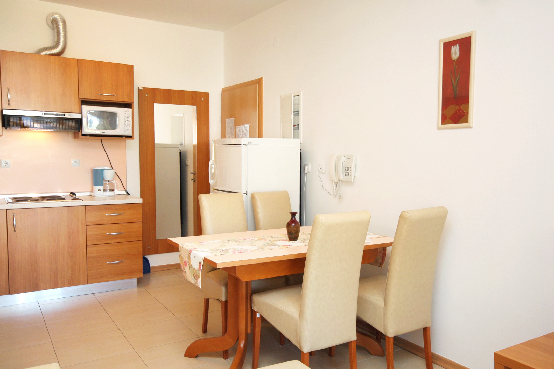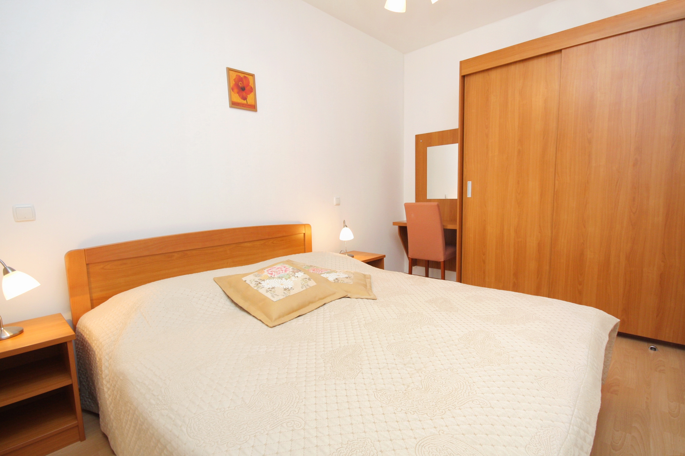 Apartment can accommodate 4 guests. Beds are situated in 1 sleeping rooms, but also in the living room, within 33m2. Guests can use a private terrace to enjoy the warm summer evenings. The apartment offers the sea view. Food can be prepared using barbecue which is shared with other guests too. Shared pool is on disposal during stay. For the booked accommodation unit the deposit is paid directly to the owner upon check-in (deposit amount is displayed on the website) INCLUDED IN THE PRICE: final cleaning, air-conditioning, pool, parking, internet, hairdryer. OBLIGATORY ADDITIONAL COSTS: tourist tax (adults €0.93 - €1.90 nightperson, discount for children aged 12 - 17), deposit (€100.00 one-time payment). The availability of additional services for your chosen dates of stay, as well as their prices (if none are listed) must be checked ahead of time. Any additional services not shown in the price calculation are payable directly to the property owner and only if used by the visitor.