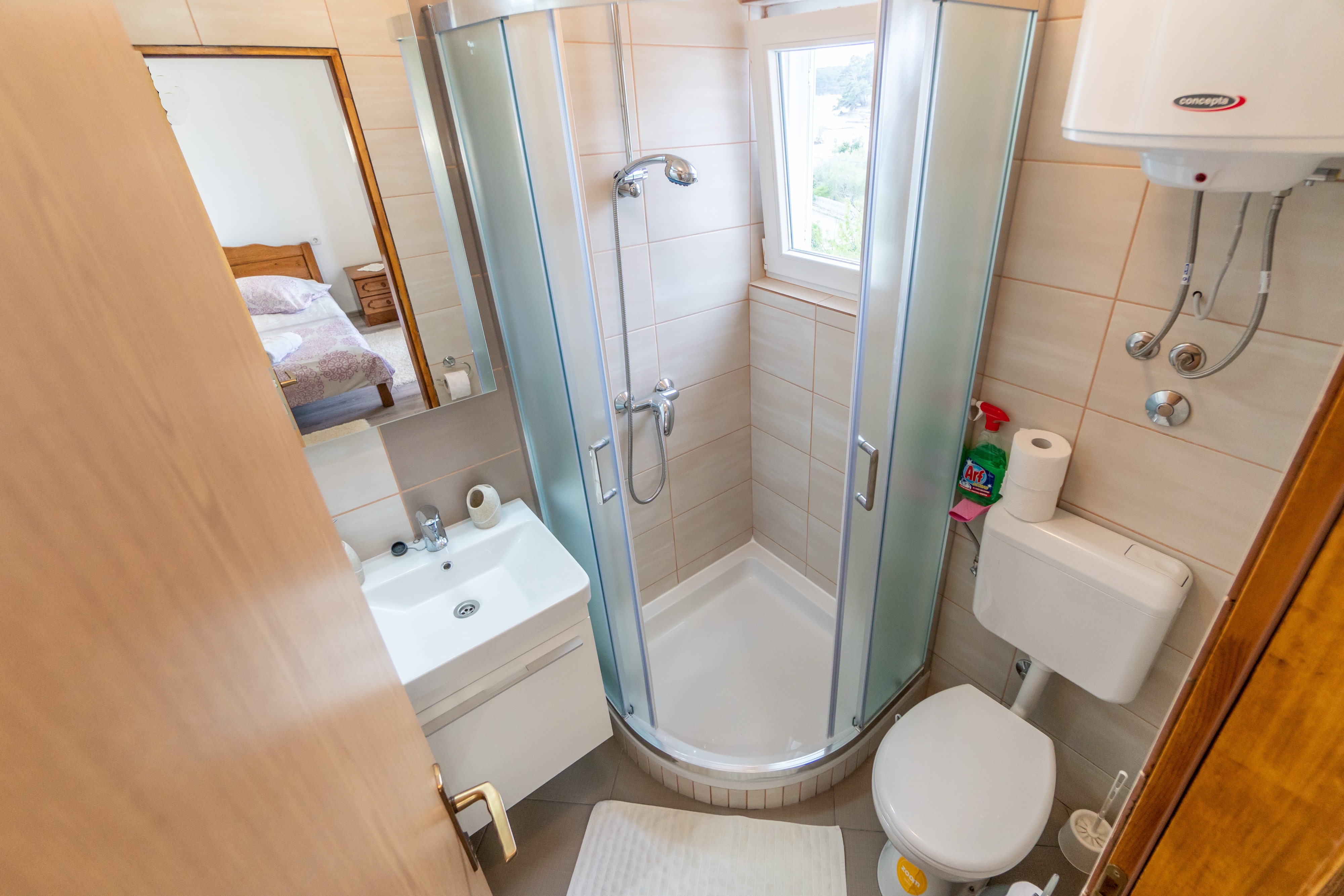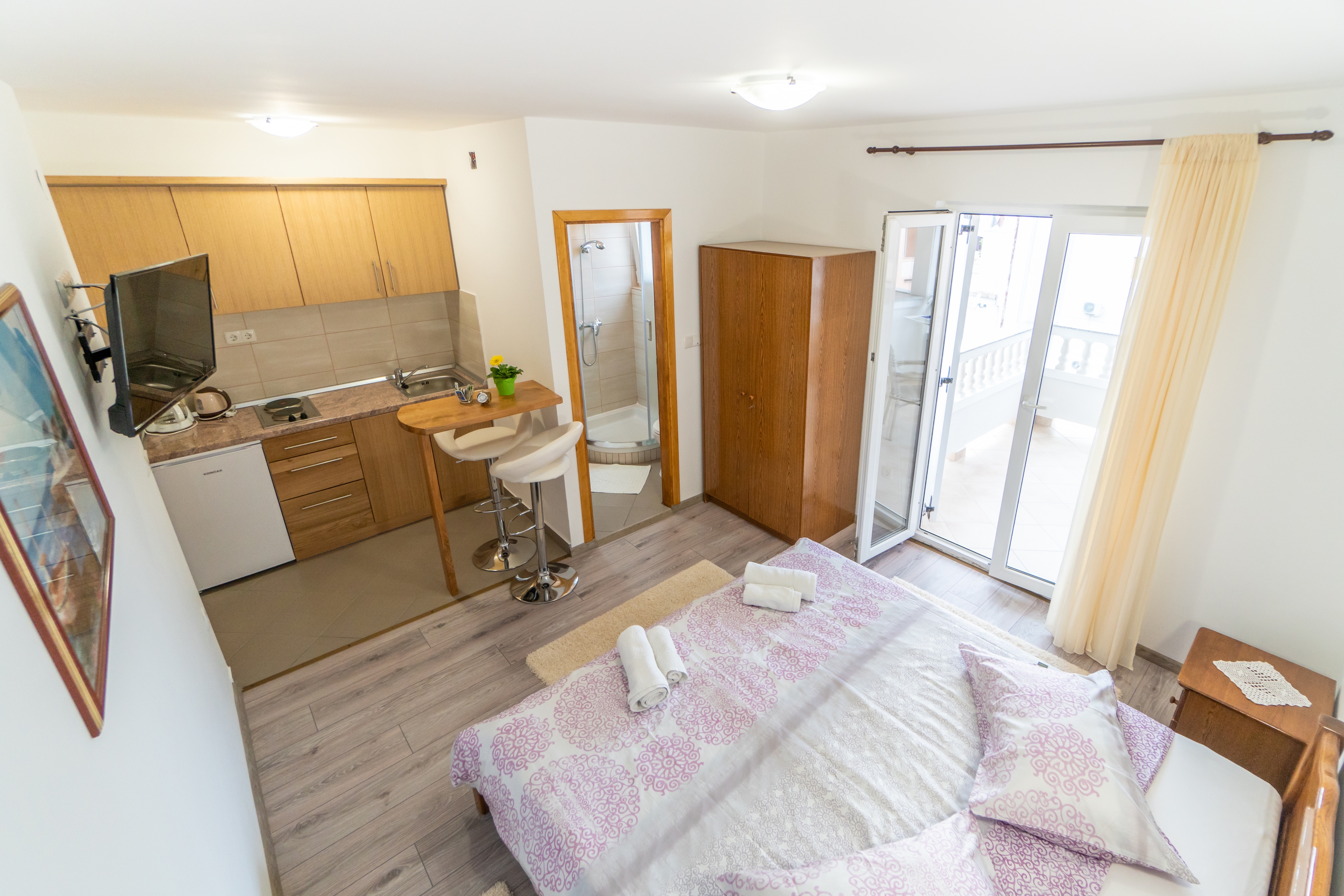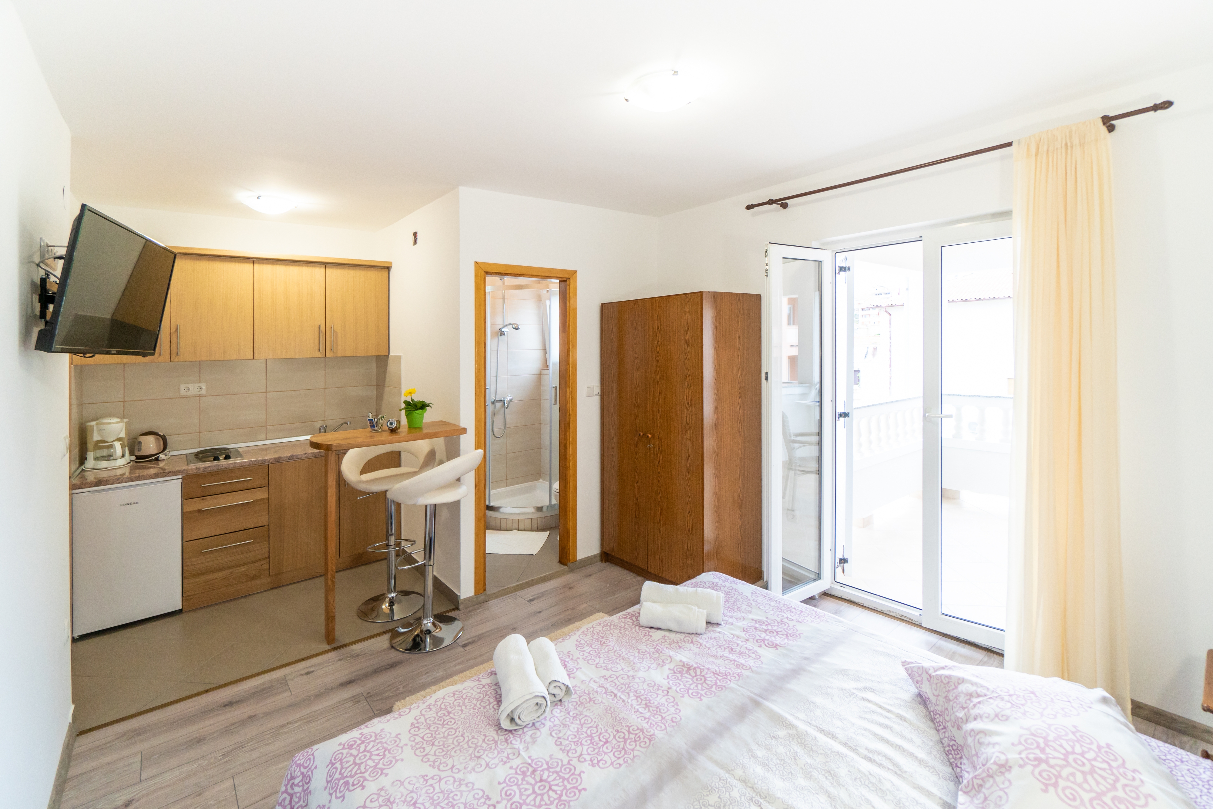 Studio flat can accommodate 2 guests. Beds are situated in 1 sleeping rooms, within 21m2. Guests can use a private terrace to enjoy the warm summer evenings. The studio offers the sea view. Food can be prepared using barbecue which is shared with other guests too. This accommodation unit welcomes pets at an additional charge. INCLUDED IN THE PRICE: tourist tax, final cleaning, air-conditioning, parking, internet, portable barbecue. OBLIGATORY ADDITIONAL COSTS: short stay fee (surcharge depending on a number of booked nights: 30% - 1, 20% - 2, 10% - 3). OPTIONAL ADDITIONAL COSTS: breakfast (€15.00, a 50% discount for children aged 4 to 12 years, Children up to age 4 free of charge), boat mooring (€10.00 per night), pets (€10.00 per night). The availability of additional services for your chosen dates of stay, as well as their prices (if none are listed) must be checked ahead of time. Any additional services not shown in the price calculation are payable directly to the property owner and only if used by the visitor.