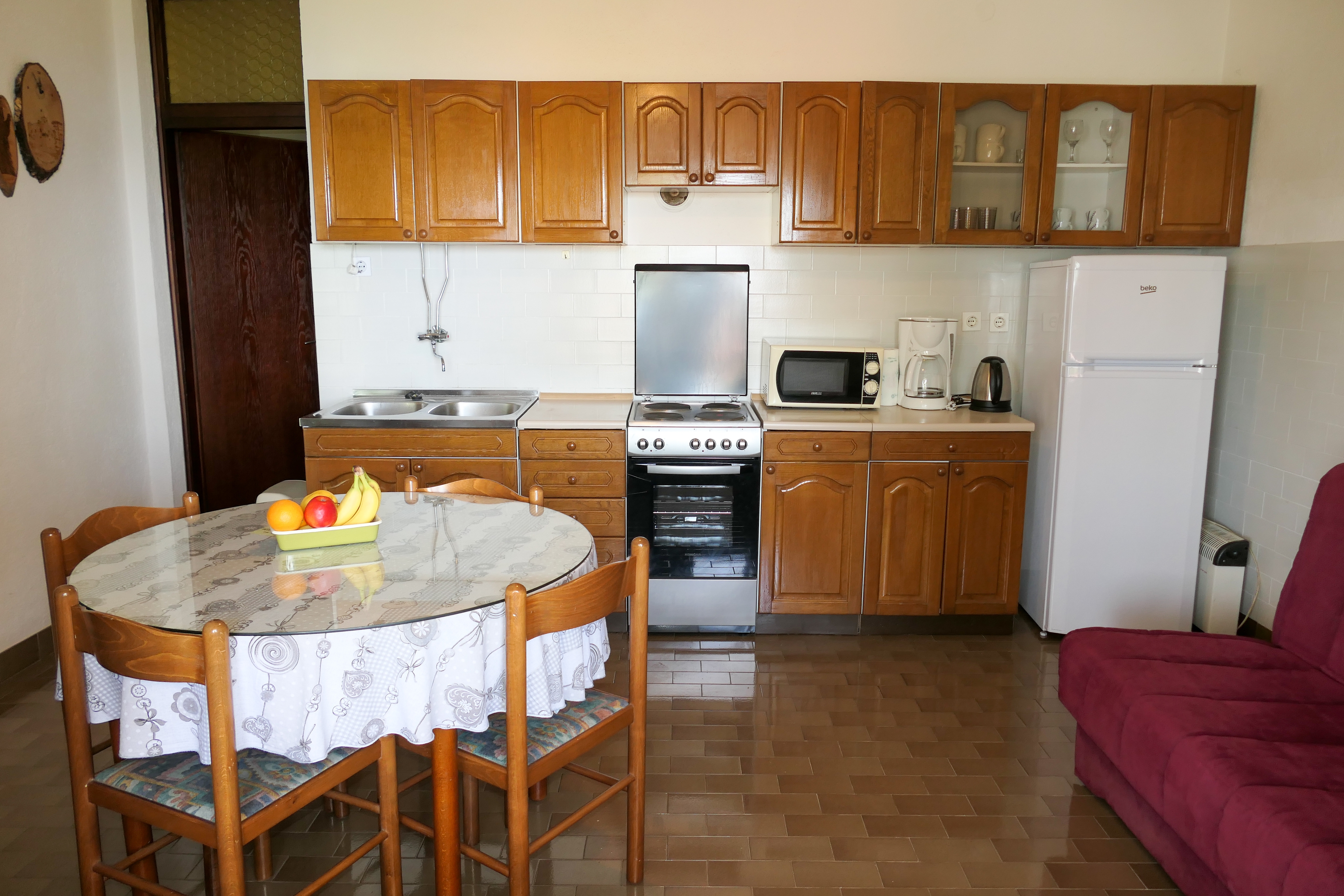 Apartment can accommodate 4 guests. Beds are situated in 1 sleeping rooms, but also in the dining room, within 36m2. Guests can use a private terrace to enjoy the warm summer evenings. Food can be prepared using barbecue which is shared with other guests too. This accommodation unit welcomes pets at no additional costs. INCLUDED IN THE PRICE: tourist tax, final cleaning, parking, internet, pets, baby cot, iron, ironing board, hairdryer. OBLIGATORY ADDITIONAL COSTS: short stay fee (surcharge depending on a number of booked nights: 30% - 1, 20% - 2, 10% - 3). OPTIONAL ADDITIONAL COSTS: air-conditioning (€5.00 per night), laundry (€3.00 washing). The availability of additional services for your chosen dates of stay, as well as their prices (if none are listed) must be checked ahead of time. Any additional services not shown in the price calculation are payable directly to the property owner and only if used by the visitor.