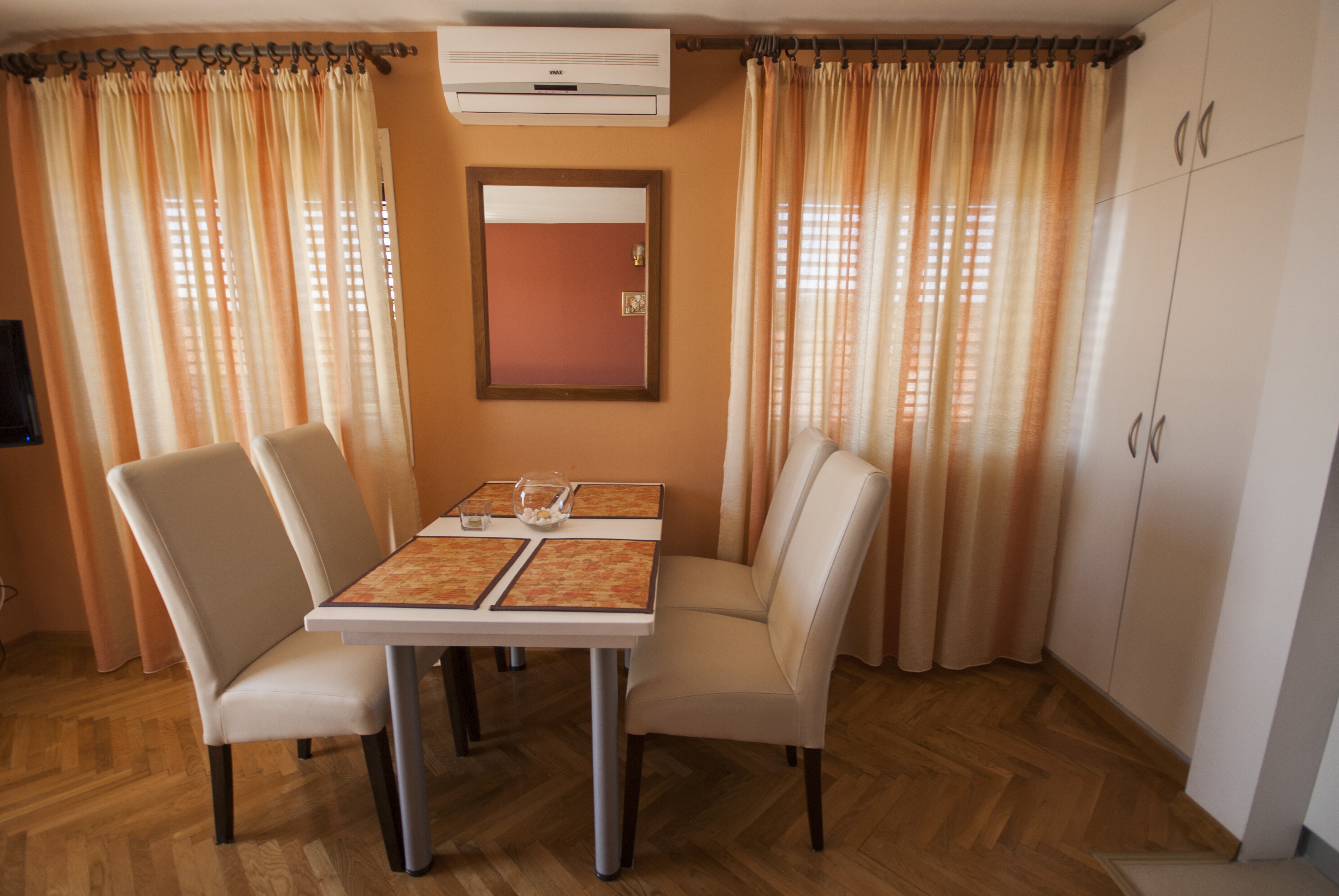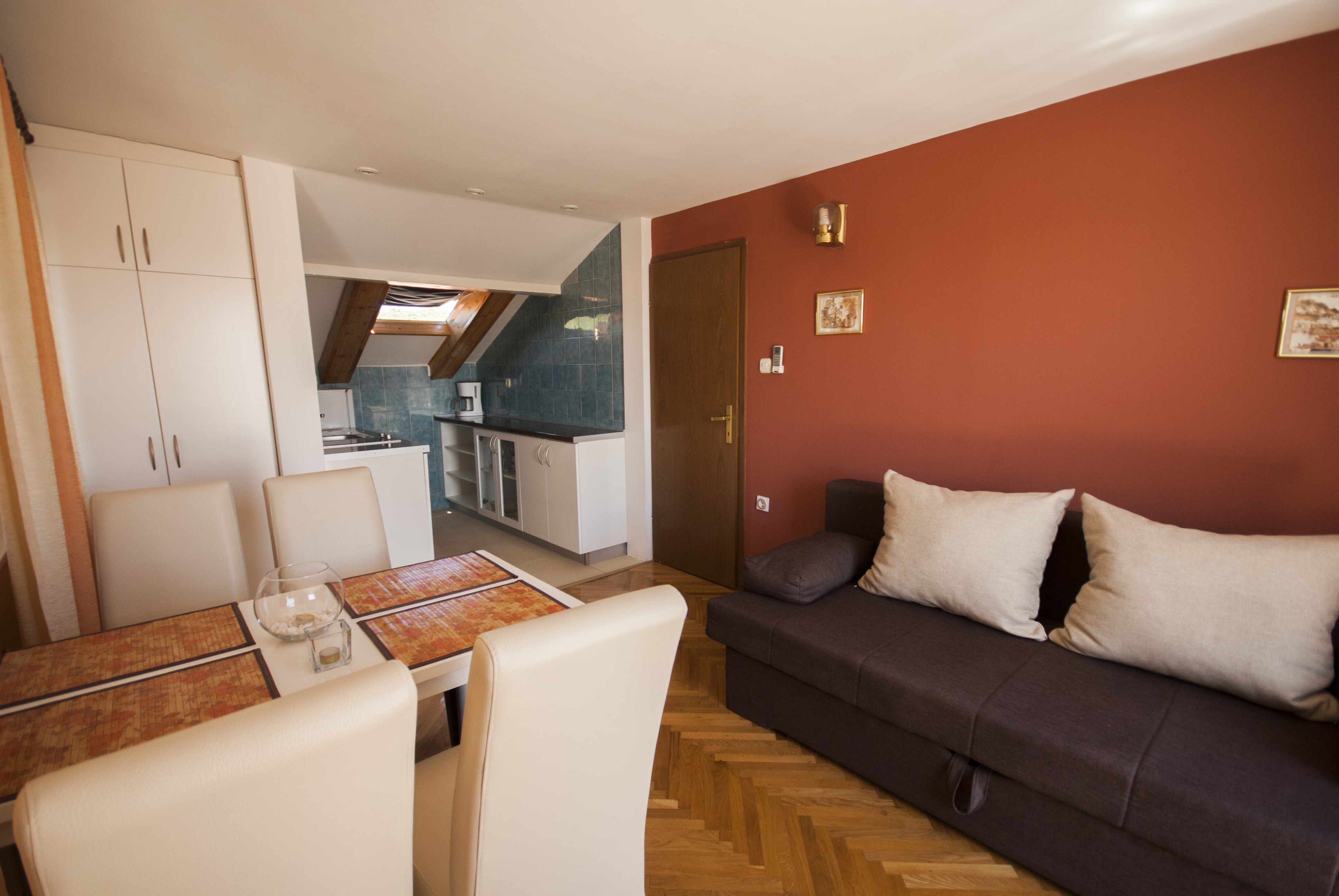 Apartment can accommodate 4 guests. Beds are situated in 1 sleeping rooms, but also in the living room, within 37m2. Guests can use a private terrace to enjoy the warm summer evenings. The apartment offers the sea view. Food can be prepared using barbecue which is shared with other guests too. This accommodation unit welcomes pets at an additional charge. INCLUDED IN THE PRICE: tourist tax, final cleaning, air-conditioning, parking, internet, laundry, iron, ironing board, hairdryer. OBLIGATORY ADDITIONAL COSTS: short stay fee (surcharge depending on a number of booked nights: 30% - 1, 20% - 2, 10% - 3). OPTIONAL ADDITIONAL COSTS: pets (€5.00 per night). The availability of additional services for your chosen dates of stay, as well as their prices (if none are listed) must be checked ahead of time. Any additional services not shown in the price calculation are payable directly to the property owner and only if used by the visitor. Discounts to the base price: free day 28=25 (for stays of 28 days or more, we give you 3 days free of charge for the stay until 31122026).