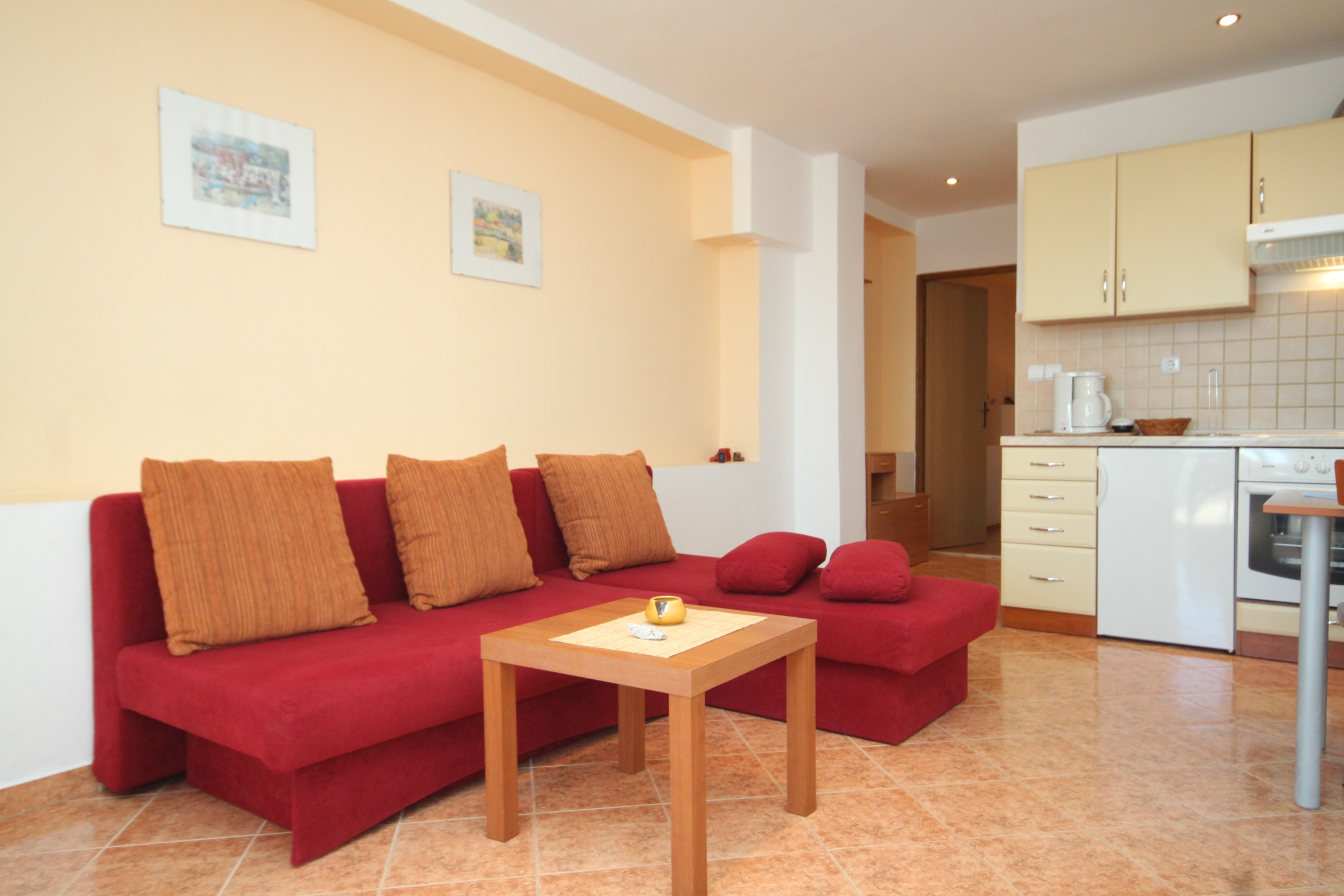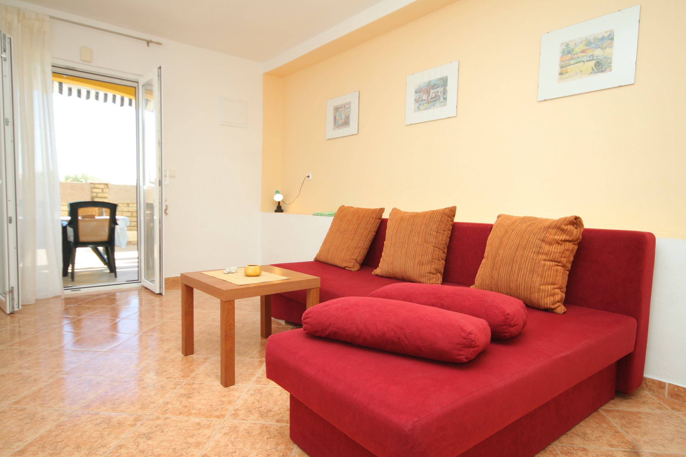 Apartment can accommodate 4 guests. Beds are situated in 1 sleeping rooms, but also in the living room, within 38m2. Guests can use a private terrace to enjoy the warm summer evenings. The apartment offers the sea view. Food can be prepared using barbecue which is shared with other guests too. This accommodation unit welcomes pets at an additional charge. INCLUDED IN THE PRICE: tourist tax, final cleaning, air-conditioning, parking, internet, baby cot, additional bed, iron, ironing board, hairdryer, sunshade, sunchairs. OPTIONAL ADDITIONAL COSTS: pets (€5.00 per night). The availability of additional services for your chosen dates of stay, as well as their prices (if none are listed) must be checked ahead of time. Any additional services not shown in the price calculation are payable directly to the property owner and only if used by the visitor.