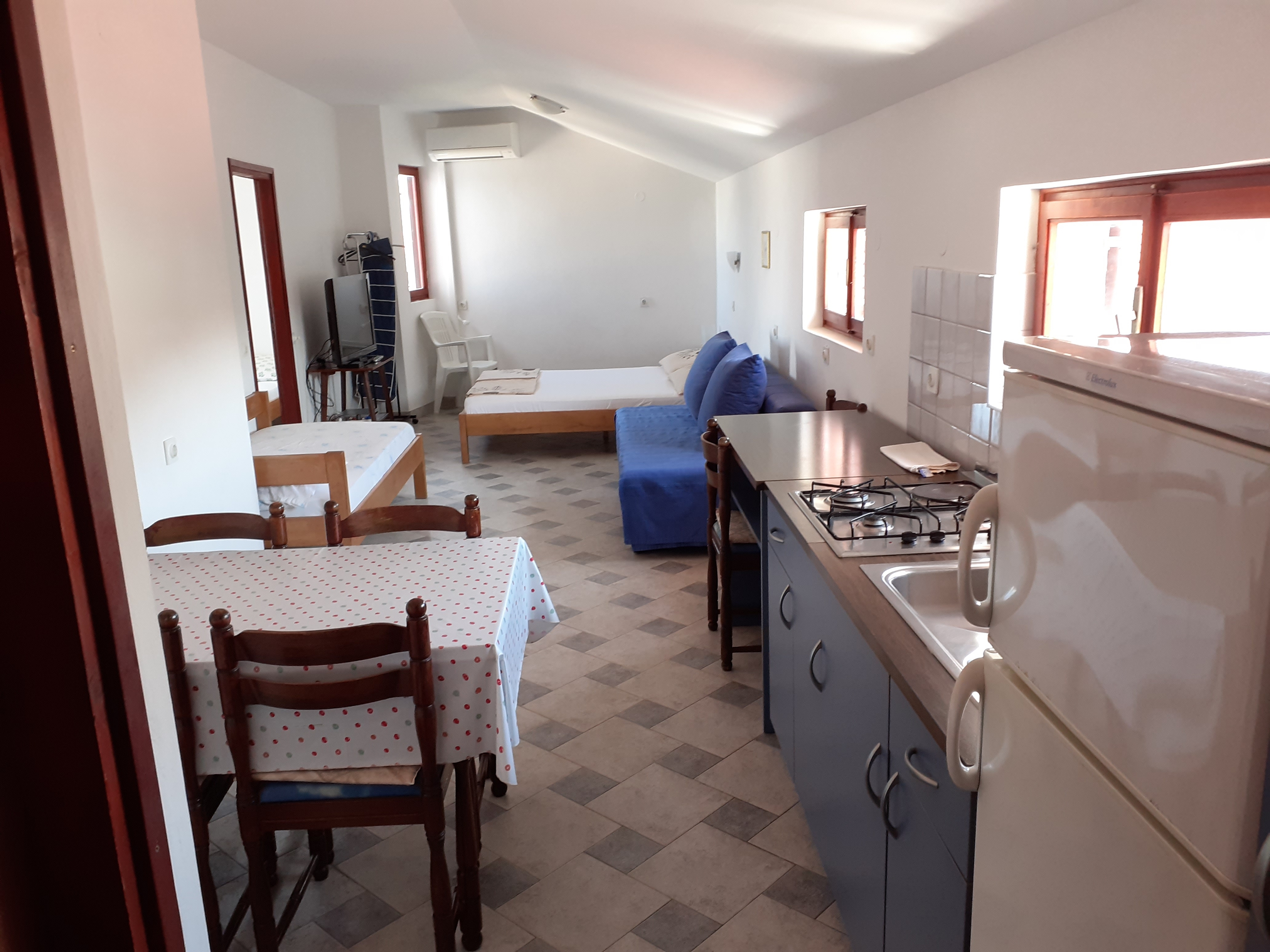 Studio flat can accommodate 5 guests. Beds are situated in 1 sleeping rooms, but also in the living room, within 38m2. Guests can use a private terrace to enjoy the warm summer evenings. The studio offers the sea view. Food can be prepared using barbecue which is shared with other guests too. INCLUDED IN THE PRICE: tourist tax, final cleaning, internet, laundry, portable barbecue. OBLIGATORY ADDITIONAL COSTS: short stay fee (surcharge depending on a number of booked nights: 30% - 1, 20% - 2, 10% - 3). OPTIONAL ADDITIONAL COSTS: air-conditioning (€5.00 per night). The availability of additional services for your chosen dates of stay, as well as their prices (if none are listed) must be checked ahead of time. Any additional services not shown in the price calculation are payable directly to the property owner and only if used by the visitor. Discounts to the base price: free day 21=19 (for reservations of 21 or more days you get 2 free days for the stay until 31122026).